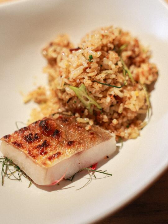 主食是马友鱼配米饭;米饭吃起来算不上粒粒分明,但是香草味与各类野菜的香味和谐且浓郁,还带有淡淡的鲜味,是好吃的。