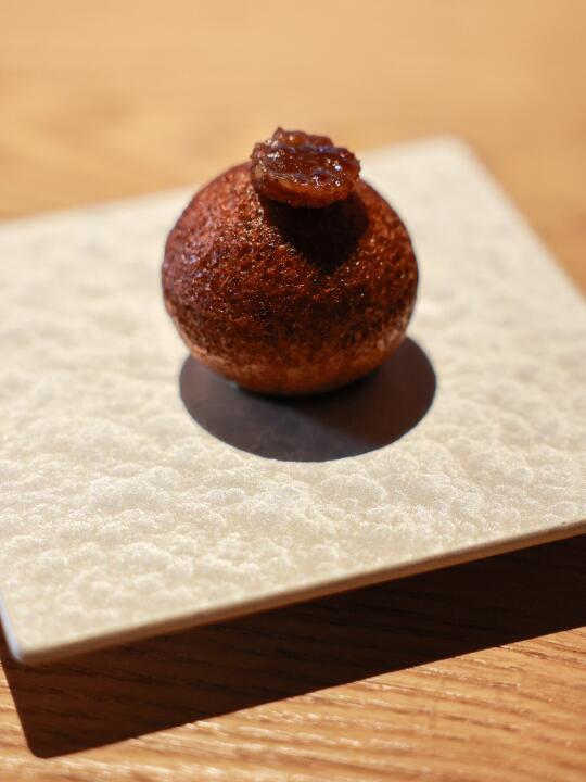 玉米香气很足,吃起来像冰淇淋的浓缩版。盖在上面的陈皮片质地沙沙的,反倒是没那么脆了。