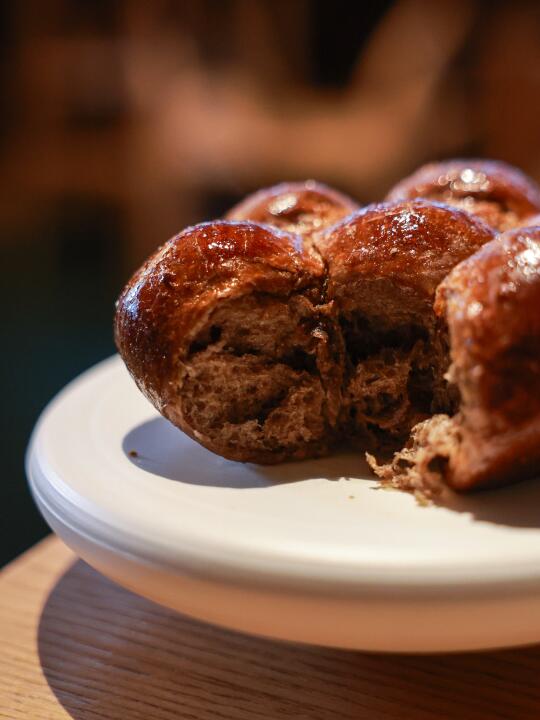 热气腾腾的面包散发着一股淡淡的酒香味,黑果做的酱汁闻着和单纯舔一口的时候,是甜甜的,可真抹在面包上,吃起来又带着淡淡的苦味。