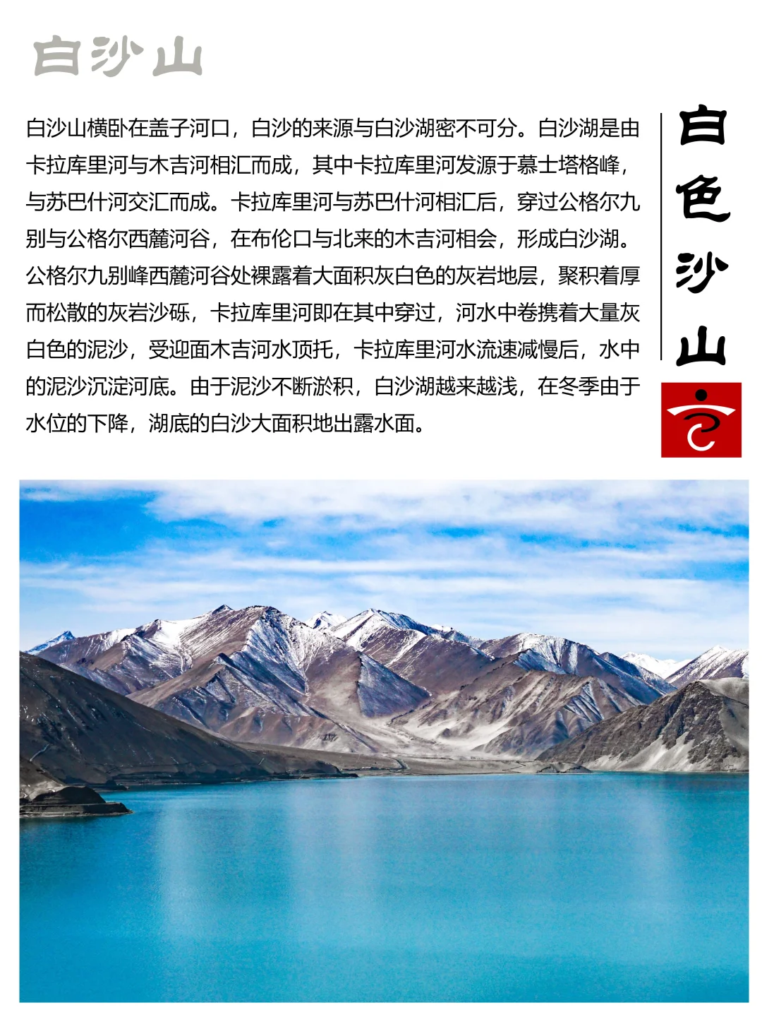 公格尔九别峰西麓河谷处裸露着大面积灰白色的灰岩地层,聚积着厚而松散的灰岩沙砾,卡拉库里河即在其中穿过,河水中卷携着大量灰白色的泥沙,受木吉河水顶托,卡拉库里河水流速减慢后,水中的泥沙沉淀白沙湖底,枯水期时裸露,在风口风力搬运下,沉积在了盖子峡谷迎风坡,形成了白沙山。白沙山下的白沙湖也叫布伦口湖,由卡拉库里河与木吉河相汇而成,2010年在此修建布伦口水库大坝。