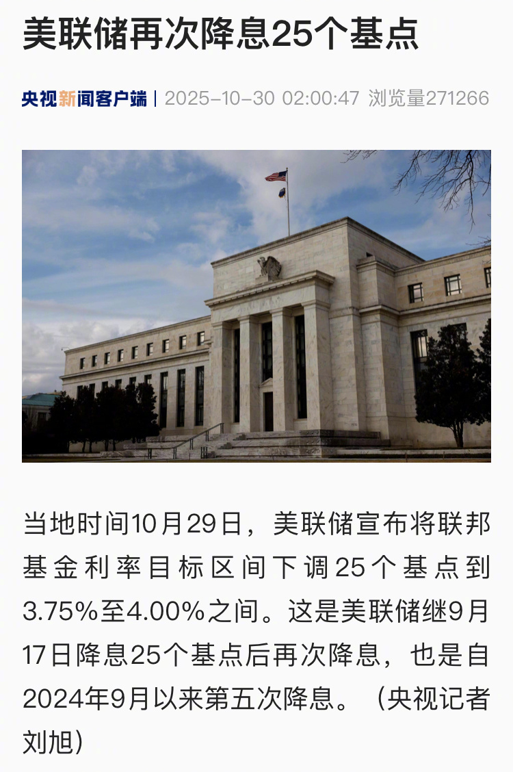 【#美联储继续降息#】美国东部时间10月29日下午,北京时间今天(10月30日)凌晨,美国联邦储备委员会结束为期两天的货币政策会议,宣布再次将联邦基金利率目标区间下调25个基点到3.75%至4.00%之间。这是继上个月开启降息进程后,美联储连续第二次降息25个基点。#美联储连续第二次降息25个基点#