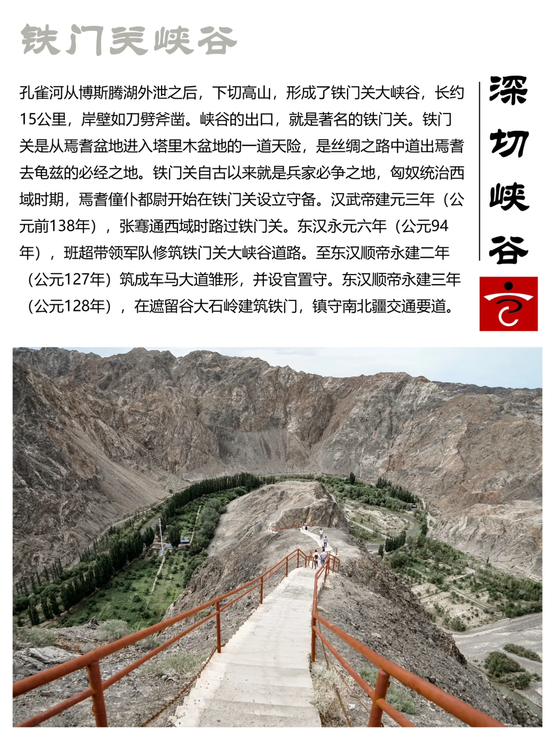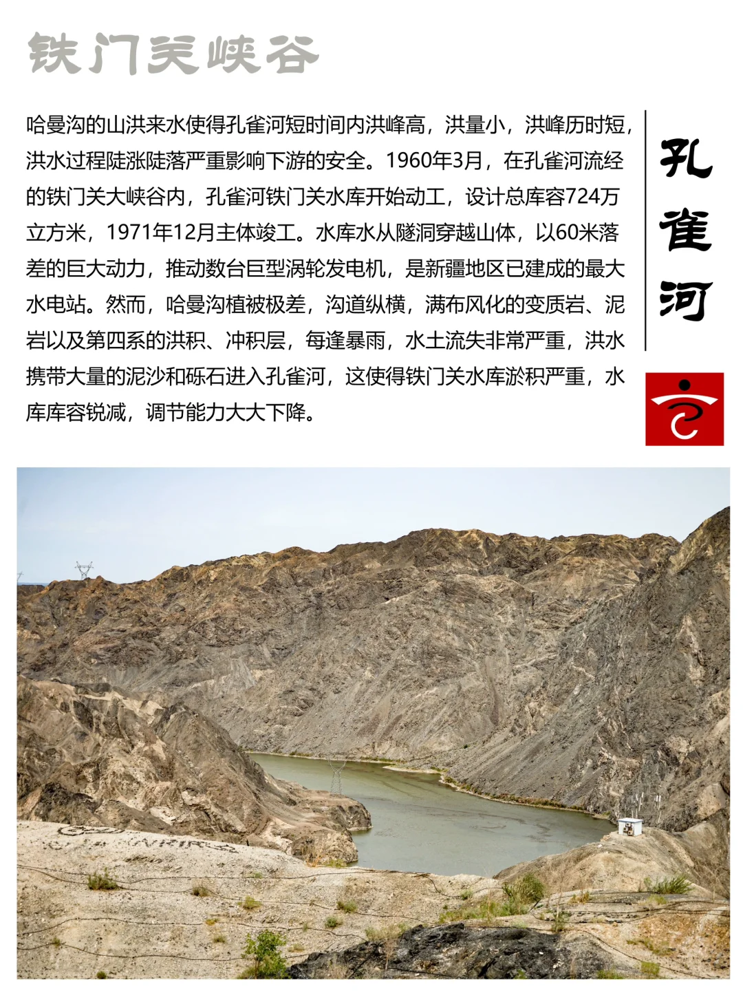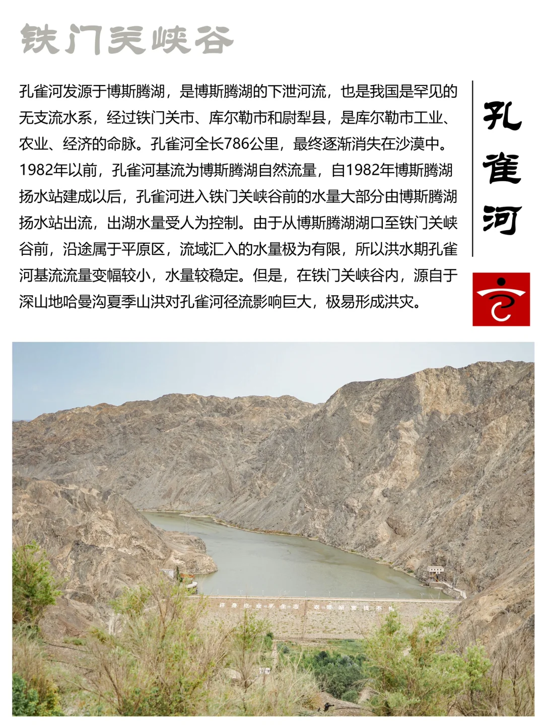 孔雀河发源于博斯腾湖,是博斯腾湖的下泄河流,也是我国是罕见的无支流水系,是库尔勒市工业、农业、经济的命脉,全长786公里,曾经注入罗布泊。孔雀河进入山区后,向下深切,形成了长达15公里的铁门关大峡谷。为了防止孔雀河峡谷哈曼沟山洪对下游的威胁,上世纪60年代在这里修建了铁门关水库。铁门关峡谷是丝绸之路中道出焉耆去龟兹的必经之地,峡谷末端为著名的军事重地铁门关。