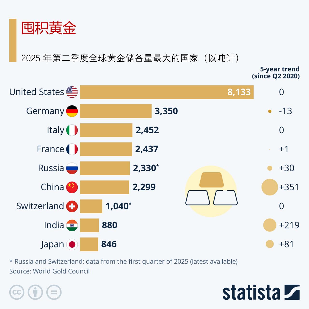 我国黄金储备怎么样?哪个国家的黄金储备量最大,中国黄金储备量是多少? 在这样一个经济危机频发、地缘政治局势紧张且通货膨胀严重的世界里,国家的黄金储备发挥着至关重要的作用:它们能增强货币的可信度,抵御市场波动,并在危机时期提供保障。近年来,由于不确定性持续存在,世界各地的中央银行纷纷继续储备这种珍贵的金属,使得黄金成为重要的地缘经济指标。 据世界黄金协会的数据,美国是目前黄金储备量最大的国家,截至 2025 年 6 月,其黄金储备量超过 8100 吨。这些储备主要存放在富克斯诺克斯堡,约占美国外汇储备的近 75%。这体现了美国长期维持美元信誉的策略。德国(3350 吨)和意大利(2452 吨)紧随其后,而法国(2437 吨)和俄罗斯(2330 吨)仍是全球重要的参与者。 尽管美国和欧洲通常会保持历史性的黄金储备量,但亚洲却是黄金储备增长最为活跃的地区。自 2020 年以来,中国大幅增加了其黄金储备,仅在五年内就增加了约 350 吨。到 2025 年 6 月,其储备量已达到约 2300 吨,位居全球第六。中国已显著减少了对美元的依赖,并致力于增强人民币在全球舞台上的作用。印度是仅次于中国的全球第二大黄金消费国,其增长趋势也与之类似。在 2020 年至 2025 年期间,印度储备银行的黄金储备增加了超过 200 吨,使其总量接近 900 吨(位居全球第八,领先于日本)。印度正指望黄金来稳定卢比,在全球经济不稳定的情况下发挥稳定作用。