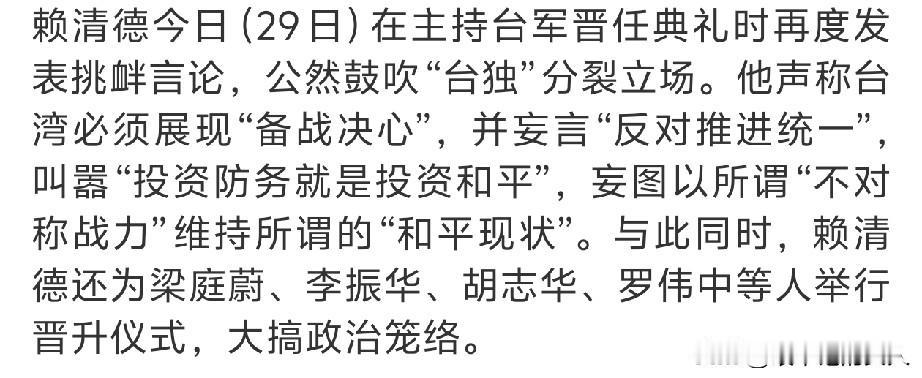 死到临头了?! 赖清德又跟“疯狗”一样开始“叫嚣”了。 反对推进统一,鼓噪以武谋独 此时此刻,他应该是感受到了巨大的压力,内心焦虑,坐立不安。 这次,跑到台军里面去给自己壮壮胆,给那些小头头们拍拍马屁,企图给他们洗洗脑,让他们跟着赖清德一起“谋独”,这是打错了算盘,如果这些台军小头头再不,睁开眼睛,认清大势,违背民意,早晚跟赖清德一样,像秋后的蚂蚱,蹦跶不了几天了。