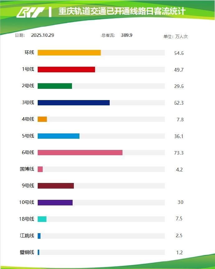 昨日(2025年10月29日,重阳节),重庆轨道交通线网客运量389.9万人次,较前一日大跌32.2w/7.63%,应该是下雨了吧?