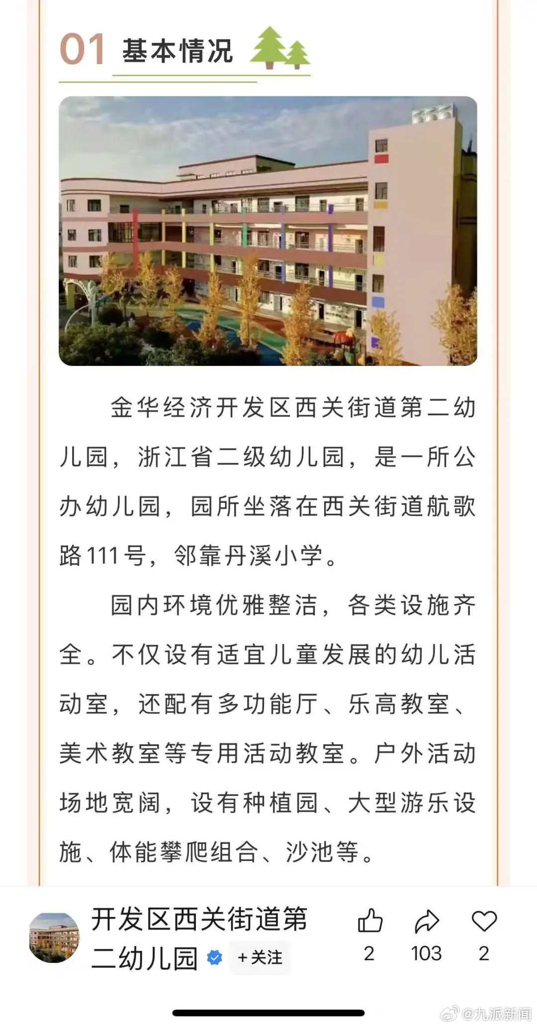 记者在西关街道第二幼儿园的招生资料中看到:金华经济开发区西关街道第二幼儿园是浙江省二级幼儿园,是一所公办幼儿园。不过该幼儿园的运营主体单位金开资产运营集团出示了相关情况的说明,集团下属幼儿园主体性质为“登记设立事业单位法人”单位,属于自收自支单位,未纳入地方财政全额保障,整体资金缺口较大。