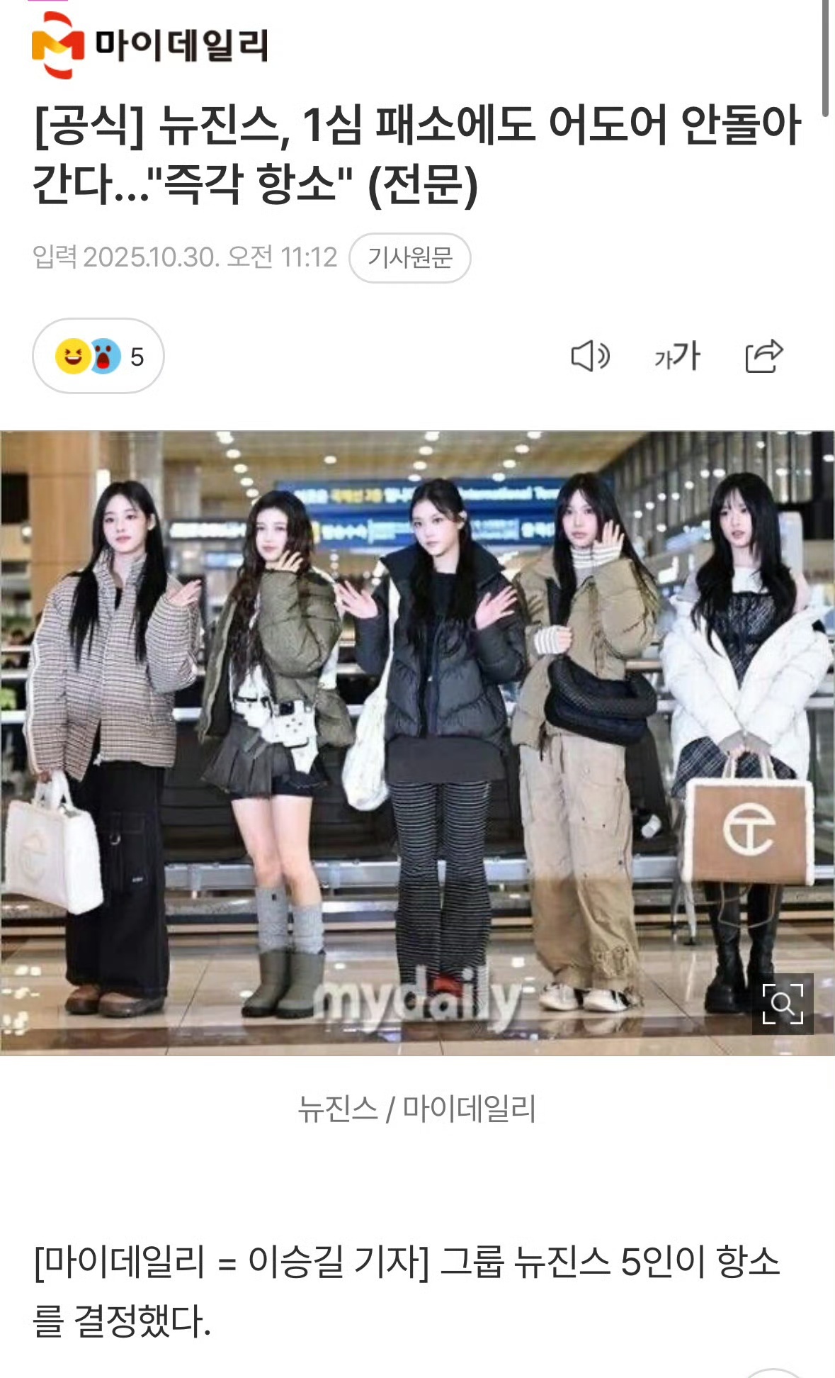 【新闻】newjeans:“不服一审判决,立即提起上诉”…绝不回ADOR