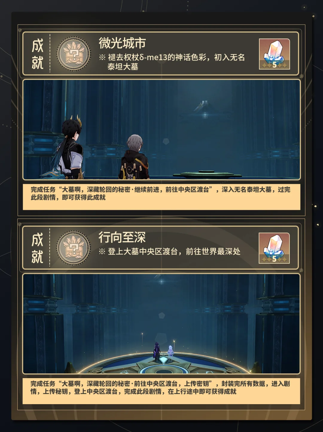 完成任务“大墓啊,深藏轮回的秘密·继续前进,前往中央区渡台”,深入无名泰坦大墓,过完此段剧情,即可获得此成就