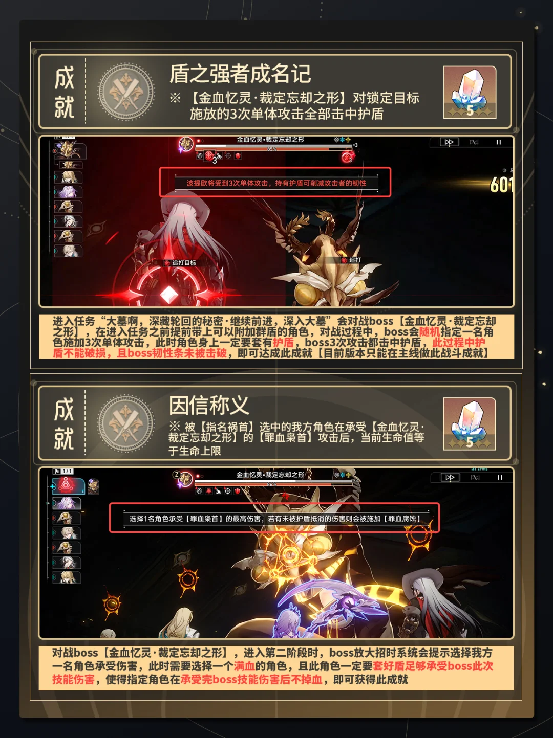 进入任务秘密·继续前进,深入大墓”会对战boss【金血忆灵·裁定忘却深藏轮在进可以附加群盾的角色,对战过程中,boss会随机指定0技取常名角施加3次单体攻击,此时角色身上一一定要套有护盾,boss3次攻击都击中护盾此过程中护盾不能破损,且boss韧性条未被击破,即可达成此成就【目前版本只能在主线做此战斗成就】