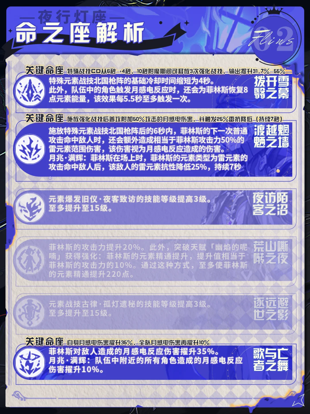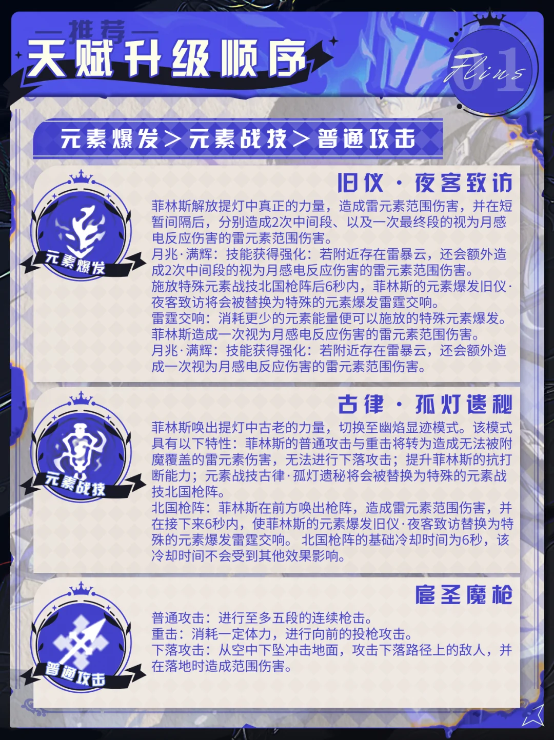 菲林斯解放提灯中真正的力量,造成雷元素范围伤害,并在短暂间隔后,分别造成2次中间段、以及一次最终段的视为月感电反应伤害的雷元素范围伤害。月兆·满辉:技能获得强化:若附近存在雷暴云,还会额外造成2次中间段的视为月感电反应伤害的雷元素范围伤害。施放特殊元素战技北国枪阵后6秒内,菲林斯的元素爆发旧仪夜客致访将会被替换为特殊的元素爆发雷霆交响。雷霆交响:消耗更少的元素能量便可以施放的特殊元素爆发。菲林斯造成一次视为月感电反应伤害的雷元素范围伤害。月兆·满辉:技能获得强化:若附近存在雷暴云,还会额外造成一次视为月感电反应伤害的雷元素范围伤害。
