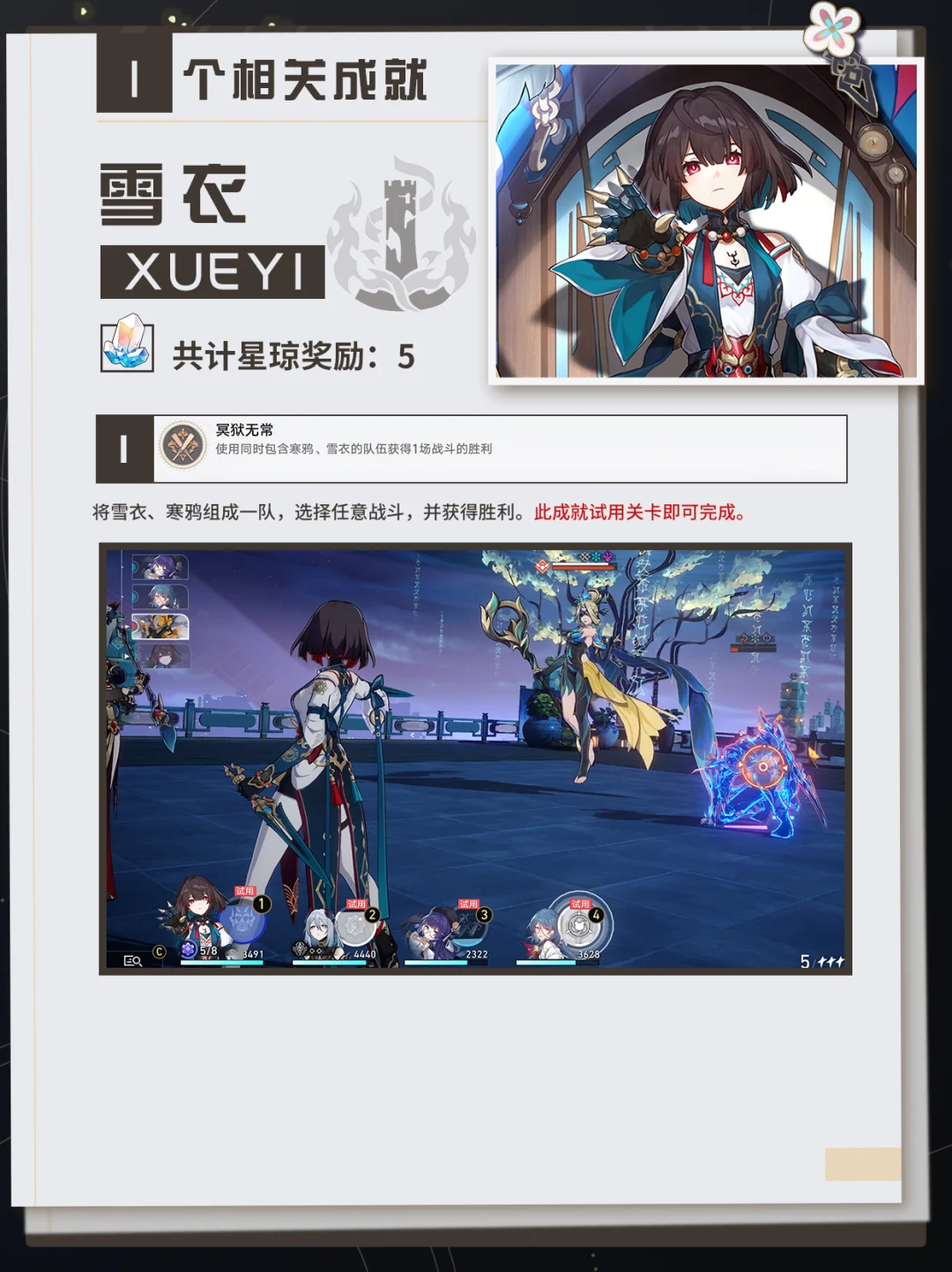 冥狱无常:将雪衣、寒鸦组成一队,选择任意战斗,并获得胜利。此成就试用关卡即可完成。