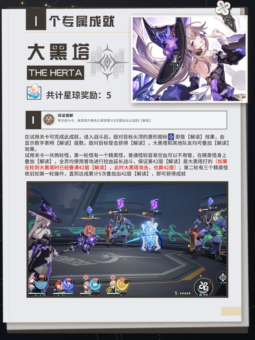 阅读理解:在试用关卡可完成此成就,进入战斗后,敌对目标头顶的菱形图标 即是【解读】效果,会显示数字表明【解读】层数,敌对目标受击获得【解读】,大黑塔和其他队友均可叠加【解读效果。试用关卡一共两轮怪,第一轮怪有一个精英怪,普通怪较容易空血可以不用管,在精英怪身上叠加【解读】,全员均使用普攻进行控血延长战斗,保证第42层【解读】是大黑塔打的(如果在轮到大黑塔时已经叠满42层【解读】,此时大黑塔攻击,也算42层);第二轮有三个精英怪依旧如第一轮操作,直到达成累计5次叠加出42层【解读】,即可获得成就