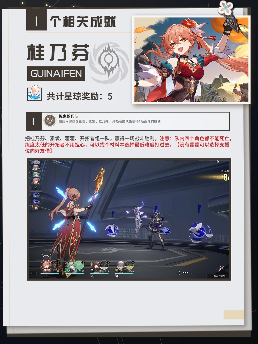 捉鬼敢死队:把桂乃芬、素裳、藿藿、开拓者组一队,赢得一场战斗胜利。注意:队内四个角色都不能死亡练度太低的开拓者不用担心,可以找个材料本选择最低难度打过去。【没有藿藿可以选择支援位向好友借】