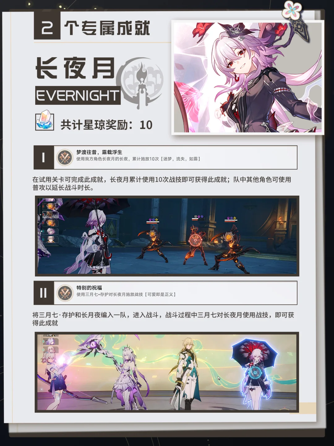 特别的祝福:将三月七·存护和长月夜编入一队,进入战斗,战斗过程中三月七对长夜月使用战技,即可获得此成就