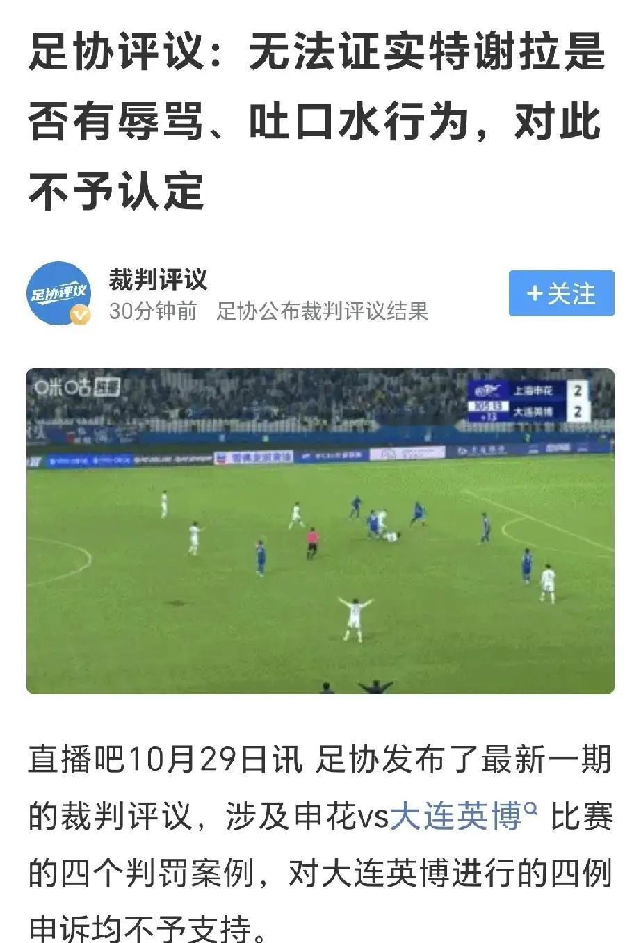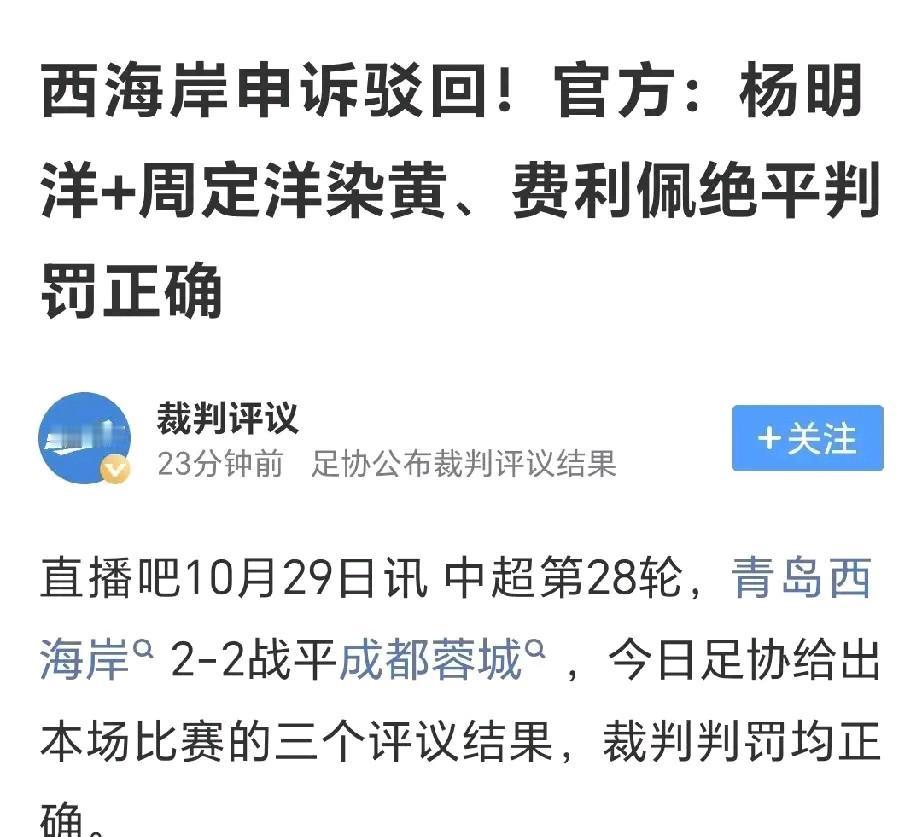 7个申诉全部驳回,小俱乐部根本没有话语权,特别是你在不争冠也不保级的时刻。 足协审议组,看起来是在维护裁判权威,其实也在变相帮助比较大的俱乐部。大连英博和青岛西海岸一共7个申诉,全部驳回,在争冠的关键时刻,足协审议组还是很独到的维护了裁判权威,也将争冠球队在程序上的争议降到最小,但是球迷来看,恰恰适得其反,看看山东泰山和上海海港那场外籍主裁判的吹罚,坚持是天壤之别。 至于大连英博和青岛西海岸,你俩也不争冠,也不保级,只能委屈了!大连英博 青岛西海岸