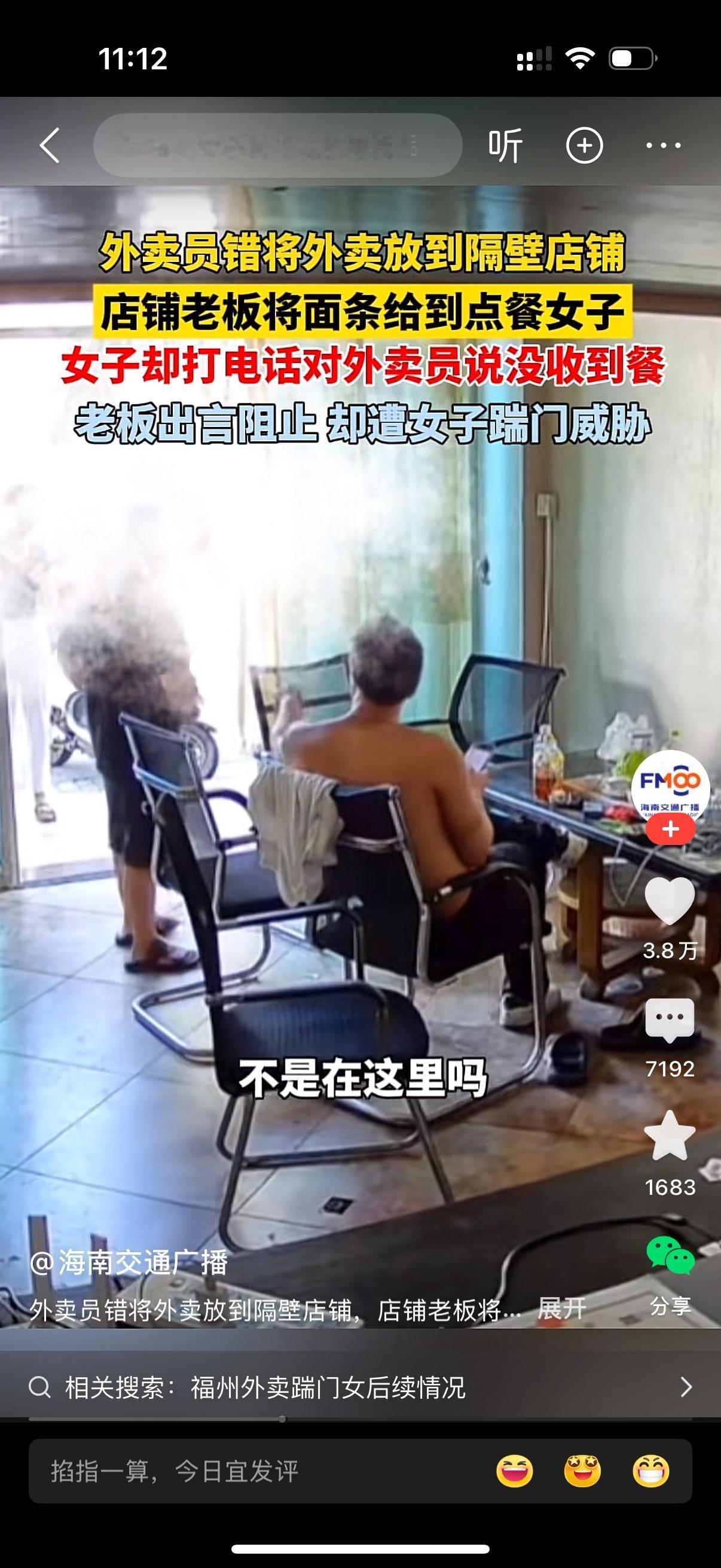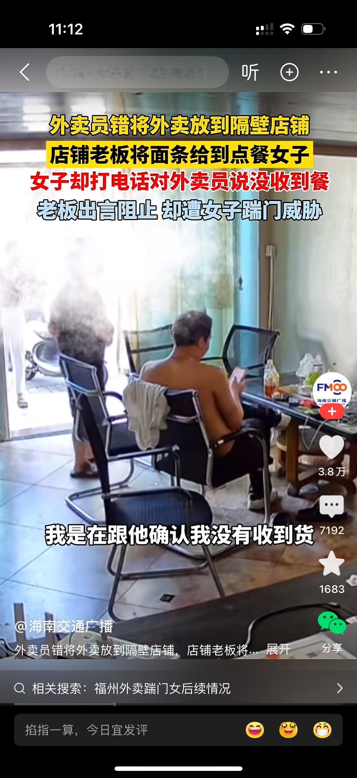 骑手把女子的外卖放在隔壁店里。女子一边从隔壁店铺老板那里取到面条,一边跟骑手说自己没有取到餐,要退款。店铺老板是一名男子,他看到女人明明取到了餐还为难外卖小哥,就仗义执言,你不是拿到了吗?你干嘛还要为难人家了?女子怒吼,我不是在跟他确认我没有收到货吗?你多管闲事。男子说,不是在你手里了吗?女子突然发神经,用脚使劲踹大门,还大喊,用你管?