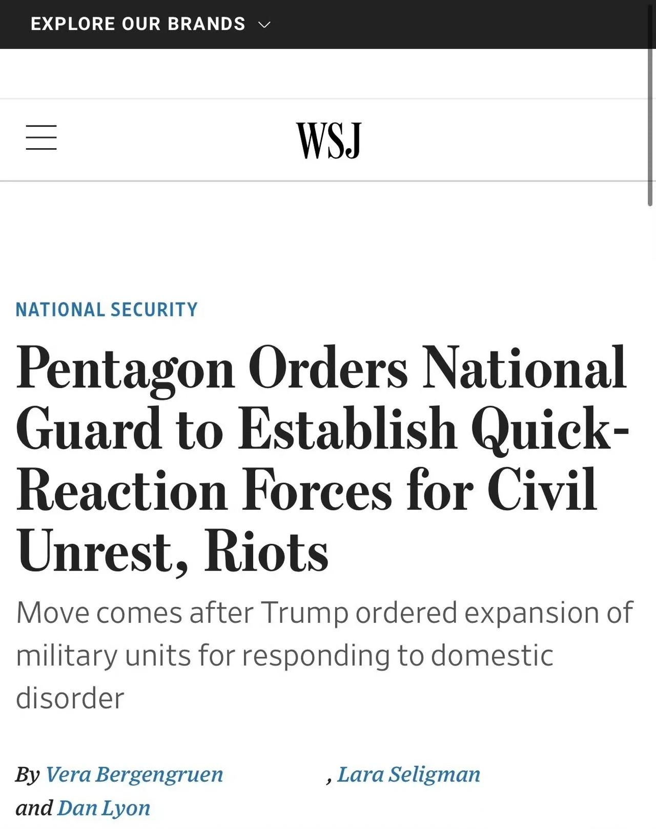 美国《华尔街日报》报道称,五角大楼已命令各州国民警卫队在2026年1月前建立“快