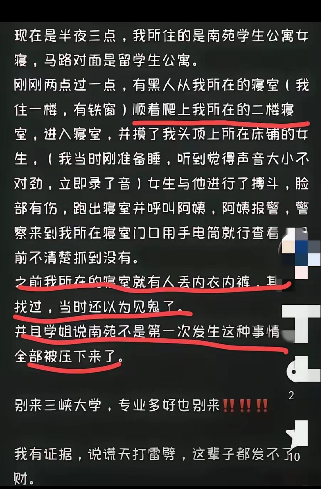 留学生夜闯女寝,这事可真让人愤怒!据报道,三峡大学一名黑人留学生凌晨翻墙潜入女生宿舍,试图猥亵女生,虽被及时制止,但女生脸部仍被抓伤。学校虽已将其刑拘并开除学籍,还加装了防护网,但这就够了吗? 此前,该女生宿舍就曾出现内衣丢失等情况,却都被学校压了下去,这才让不法分子越发大胆。学校在事件发生后,还试图封锁消息,解散宿舍群,这种做法实在令人心寒。 咱就说,留学生来中国就得守中国的规矩,可别给他们太多特权,不然只会惯出毛病。学校也别总想着捂盖子,出了事就该公开透明处理。大家觉得,除了现在这些措施,学校还该咋做才能杜绝类似事件发生呢?