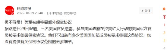 极不寻常!美军被曝签署额外保密协议 据路透社29日报道,三名美国官员透露,参与美国政府在拉美扩大行动的美国军方官员被要求签署保密协议。他们不知道有多少美国国防部成员被要求签署这些协议,也没有提供有关保密协议范围的更多细节。 美军官兵本身就有严格的国家安全保密义务,日常工作接触涉密信息都要遵守规定,现在特意额外签署一份保密文件,只能说明他们参与的拉美行动藏着不能随便说的猫腻。 美军在拉美到底在干些什么,本来就疑点重重。特朗普政府打着“打击贩毒”的旗号,在委内瑞拉附近海域动作频频。9月以来,美军已经宣称击沉了5艘所谓的“运毒船”,还打死了27个人。但这些说法根本站不住脚,美方至今没向国会提交任何确凿证据,证明那些被打沉的船真是运毒的,死者真是毒贩。 更让人起疑的是军事部署的规模,美军在加勒比海南部部署了8艘军舰、一艘核潜艇,还有超过5000名海军和海军陆战队士兵。波多黎各基地里,10架F-35战机已经就位,这可是30多年来美军在该区域最大规模的一次兵力集结。这么大的阵仗,光靠“反毒”两个字根本说不通。 这份额外的保密协议,更像是给这些行动上了道双重保险。美国国防部长赫格塞思早就开始收紧信息口子了。10月15日的备忘录里,他要求五角大楼工作人员跟国会议员说话前必须先获批。驻五角大楼的记者也被要求遵守新规矩,不少媒体办公室都被清理了。 这种级别的信息管控,通常只在高度敏感的秘密行动中才会出现。有消息说,美国中央情报局已经在委内瑞拉展开秘密行动,甚至早从2024年4月就开始策划策反马杜罗的首席飞行员。这些见不得光的操作,显然需要参与人员签协议封口。 美军南方司令部司令阿尔文·霍尔西的突然辞职,更把水搅得更浑。他本来要到两年后才卸任,现在却宣布12月就走。知情人士透露,他和赫格塞思在加勒比海行动上分歧很大,有人怀疑他是被变相解雇的。高层都吵翻了的事,自然得瞒着外界。 国会那边已经炸了锅,参议院军事委员会的民主党议员杰克·里德直接表示,霍尔西的辞职让人不安,政府根本没听有经验军人的建议。更讽刺的是国会议员们连加勒比海打击行动的关键细节都不知道,等于被彻底排除在外。 美军对保密协议的执行向来狠辣,前海豹突击队成员马特·比索内特因为出书讲了击毙本·拉丹的事,就被追着要回所有收入,理由就是违反保密协议。有这前车之鉴,现在被要求签额外协议的军方人员,肯定知道漏嘴的后果有多严重。 赫格塞思甚至还在拟订方案,要让数千名国防部人员接受随机测谎。这种层层加码的管控措施,反而让人更想知道拉美行动的真相。毕竟要是行得正坐得端,根本没必要搞这么多遮遮掩掩的手段。 从“唐罗主义”的抬头,到借反毒名义搞军事施压,美国在拉美的动作越来越出格。这份额外的保密协议,说不定就是掩盖更大动作的前奏。那些签了字的美军官兵心里可能也清楚,他们要瞒的,恐怕不只是普通的军事机密那么简单。 来源:环球时报 【极不寻常!美军被曝签署额外保密协议】