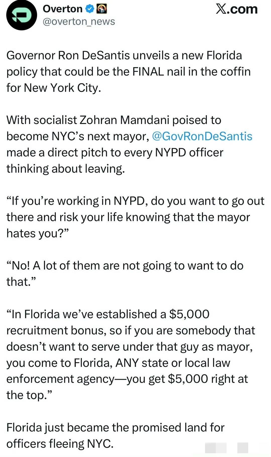 弗罗里达州长说,在纽约工作的警察,如果不满将上任的新市长仇视警察,可以到弗罗里达工作,每人将获得五千元奖励。 难以承受就逃离吧,美国那么大,总有可去的地方。