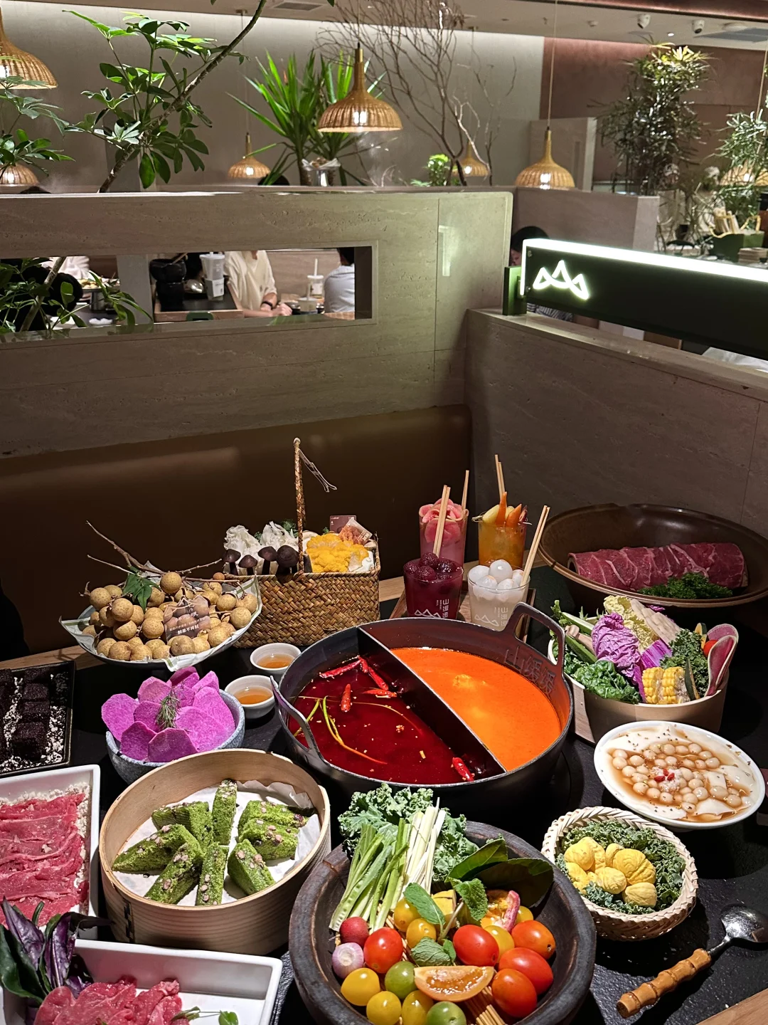 每次来德基都会排队! 几乎每周都会吃! · ✔️免费水果🆓 不同季节,不同水果,每次连吃带拿的🤪 这个季节是龙眼!!吃完俺还打包回家了!! ✔️个人推荐的菜 1️⃣野果酸汤&乐山红汤锅底 2️⃣九秒牛肉、沙姜牛肉 3️⃣杨梅汁、荔枝汁、芭乐酒酿冰粉、芭乐气泡水手工冰豆花 4️⃣麦青红豆糕、黑米糍粑(这俩每次必点!) 5️⃣紫山药、山菌F4组合、蔬菜拼盘 · 📍山缓缓火锅(南京德基店)
