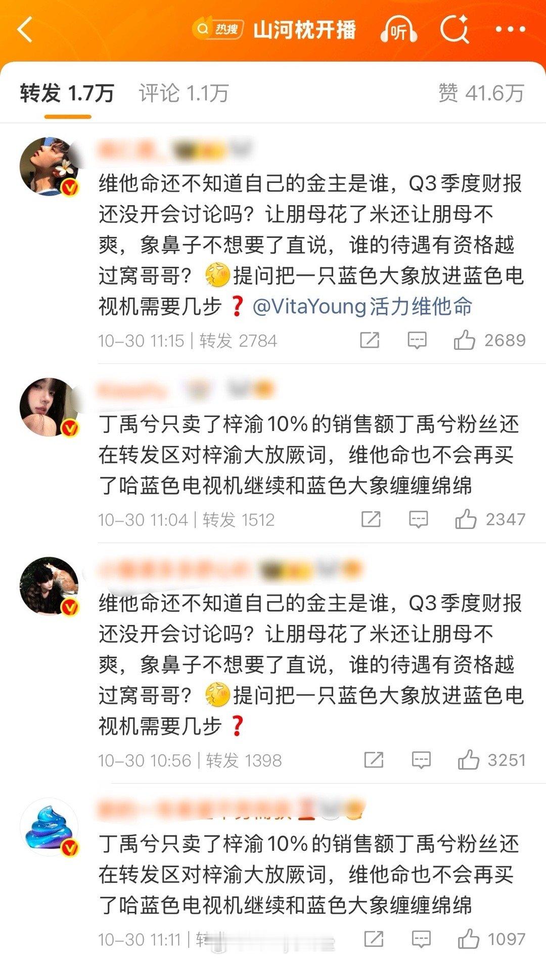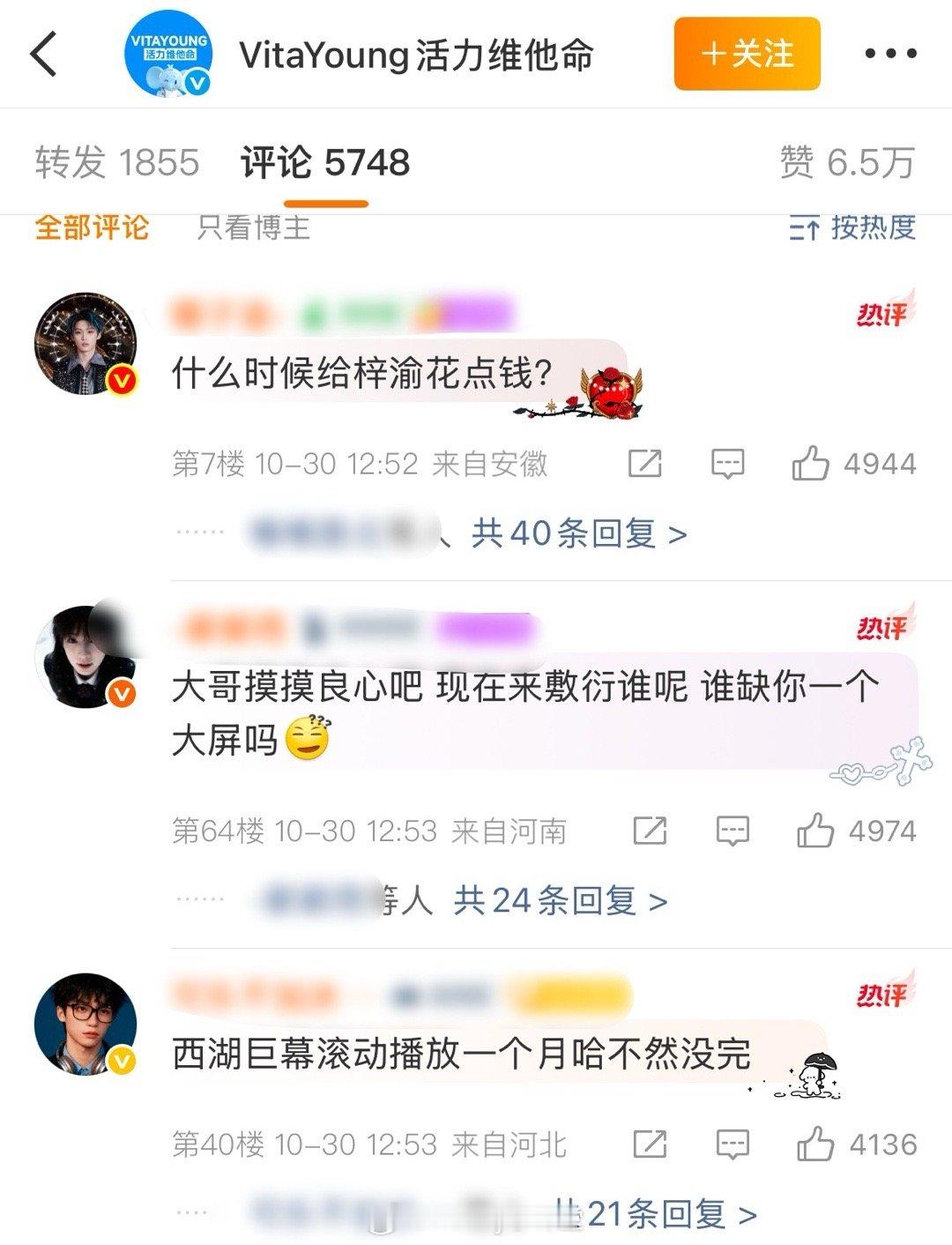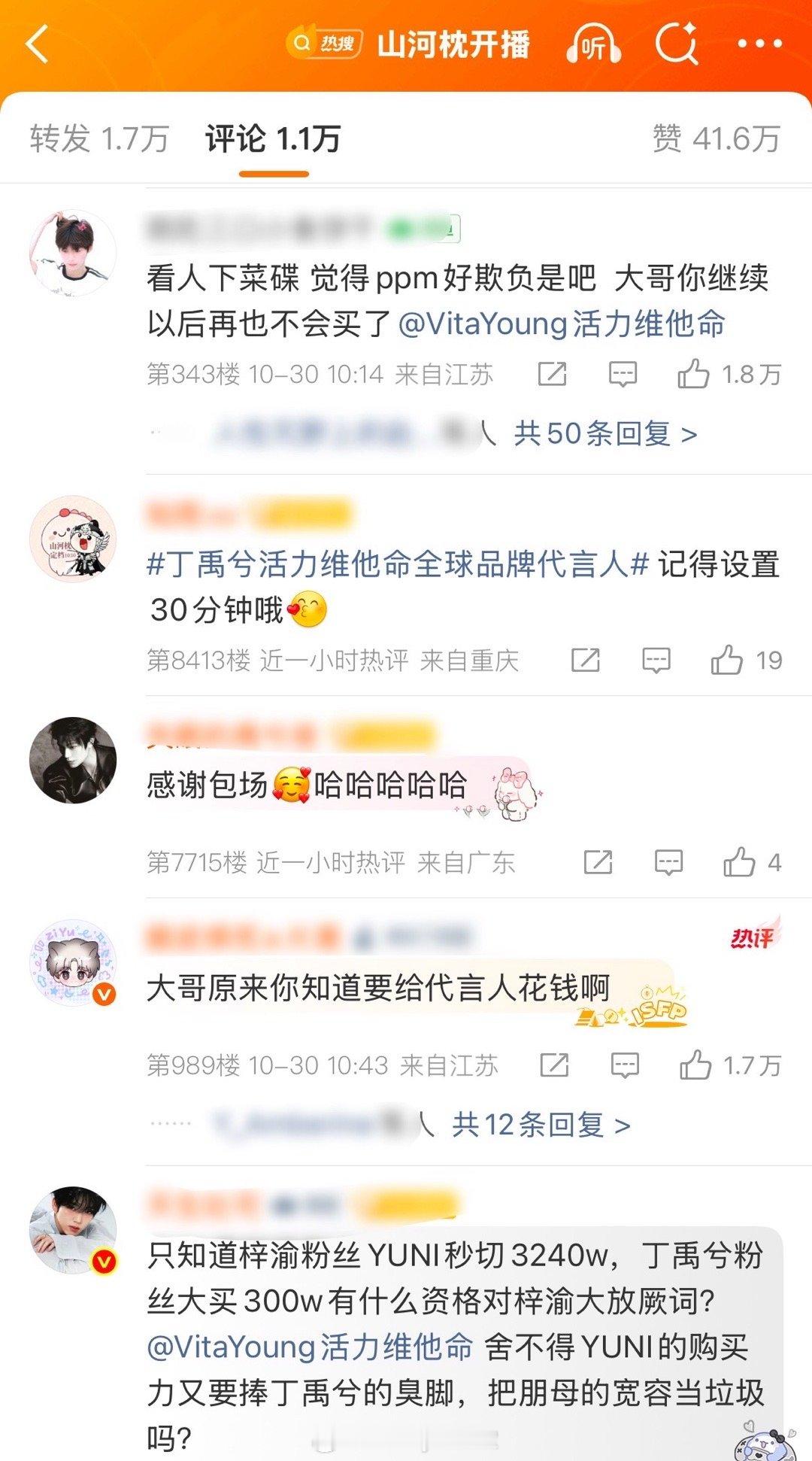 活力维他命为丁禹兮的《山河枕》安排了云包场,评论区的梓渝粉丝看不下去了,说在梓渝
