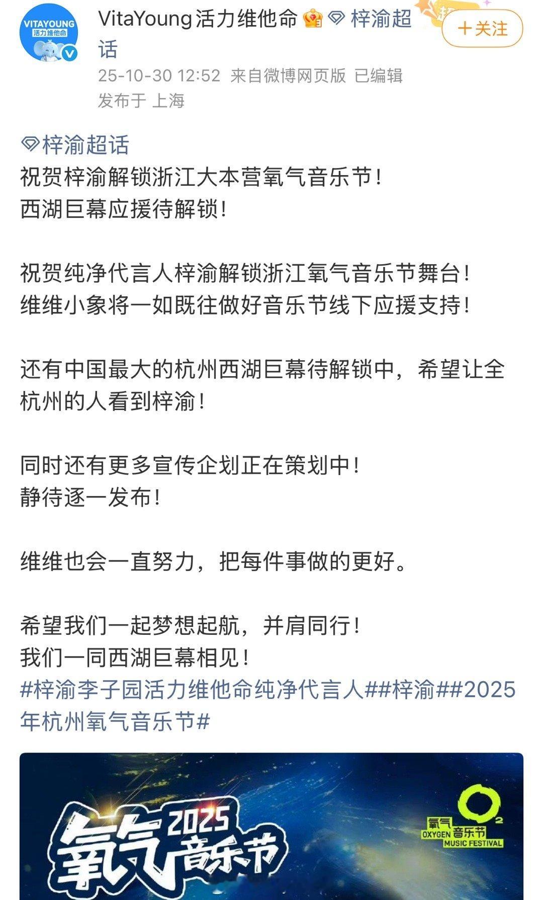 维他命给丁禹兮新剧云包场后立马又给梓渝安排了音乐节大屏应援,粉丝不买账,说太敷衍