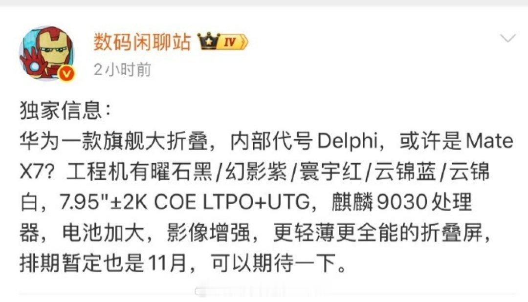 看来华为憋的大招要在11月集中释放啊,华为Mate80.华为Mate70Air 华为MateX7折叠屏,还有未知的杀手锏,你们最期待哪款新品?[阴险]