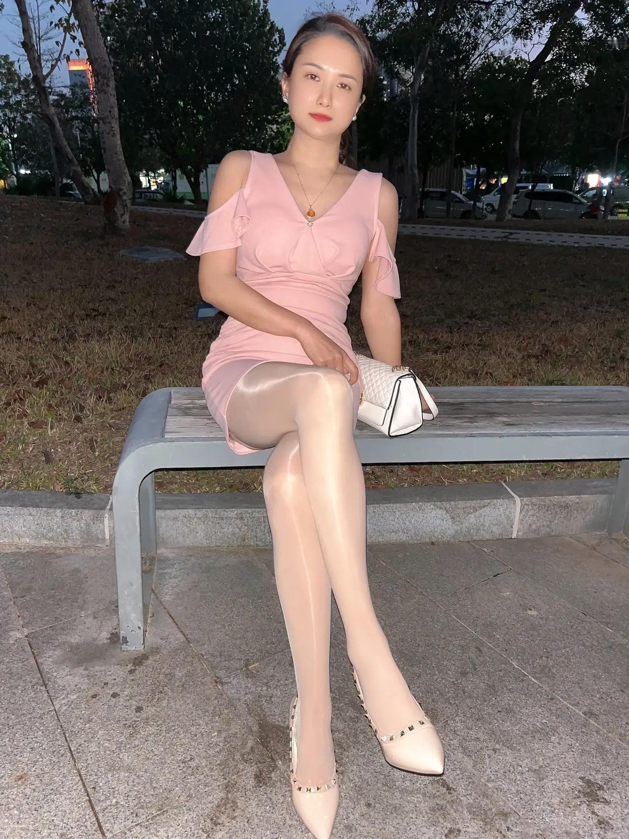夜晚公园的甜美穿搭,粉色连衣裙搭配高跟鞋,优雅动人!