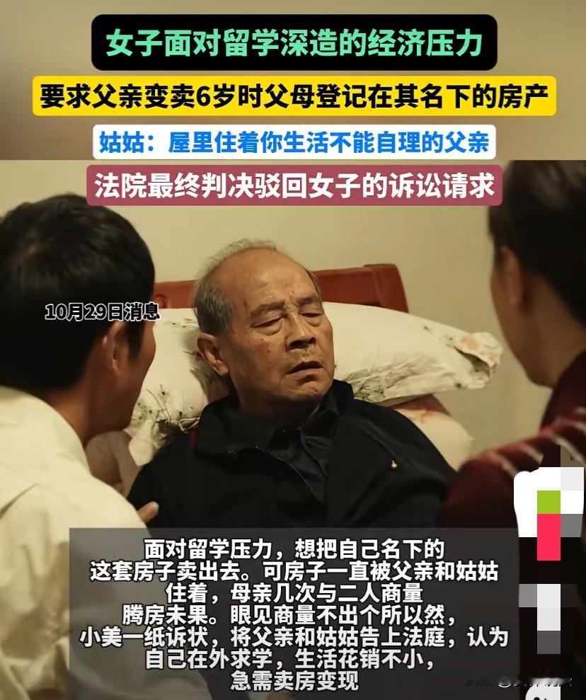 “小棉袄变黑心棉?”广东珠海,父母买了套房子,登记在年仅6岁的女儿名下,因感情不和离婚后,母亲带走女儿生活,父亲则住在了房子里。转眼多年过去了,女儿因留学深造经济压力大,认为房子是自己的,欲让患重病的父亲搬走,而后自己再把房子卖了变现,遭拒后,一纸诉状将父亲以及照顾父亲的姑姑告上法庭,法院这样判! 据悉,2008年,小美的父母买了一套80多平方米的房子。 2010年,小美的父母将房子登记在时年仅6岁的小美名下。 2013年,小美的父母因感情不和离婚,离婚时并未将房子当作夫妻共同财产进行分割。 此后,小美跟随母亲住在另一套房子内生活。而小美的父亲则搬进了这套80多平方米的房子里。 小美父母刚离婚头两年,小美还时常和父亲见面,不过12岁以后,因为各种原因就与父亲很少再见面。 转眼多年过去了,如今小美已经是一名本科毕业在即的留学生。 因还想往上深造一下,想到家里经济压力比较大,便起了心思,想把自己名下的这套80多平方的房子卖出去变现。 随后,小美得知自己的父亲和姑姑现在在这套80多平方的房子住着,便让自己的母亲和自己父亲、姑姑说道说道,让父亲和姑姑搬走,但是几次下来,都遭到了父亲和姑姑的拒绝。 眼看父母之间商量不出来个所以然,小美不耐烦了,于是一纸诉状将自己的父亲和姑姑告上法庭,要求父亲和姑姑腾房把房子还给自己。 法庭上,小美拿出房产证,证明自己是房子的所有权人。表示自己在外求学,生活花销不小,急需卖房变现,自己父亲和姑姑明明可以另购或者租房居住,就是不肯搬走。 面对小美的控诉,小美的姑姑怒斥小美,说房子住的是你患重病不能自理的父亲啊。 同时辩称,小美告错了人,房子里住的只有小美的父亲,小美的父亲早年生病做过大手术,不能自理,自己只是念及姐弟亲情,不时会住在房子里照顾小美的父亲。 小美的父亲则表示,小美姑姑说的属实,自己早在2010年,就突发脑梗,进行开颅手术后一直辗转各地住院治疗。2012年还被评定为二级伤残,长年卧病在床,小美的姑姑住在涉案房子里确实是为了照顾自己。 此外,还表示,房子虽然登记在小美的名下,但是买房的钱是自己一个人出的,本来是打算给小美爷爷奶奶住的。 现如今自己名下没有任何房产,也没有能力买房或者租房,一旦搬出去就要流落街头。 法院该怎么判呢? 1、涉案房屋属于谁的? 《民法典》第214条规定,不动产物权的设立、变更、转让和消灭,依照法律规定应当登记的,自记载于不动产登记簿时发生效力。 第216条规定,不动产登记簿是物权归属和内容的根据。 涉案房屋登记在小美的名下,所有权确实归小美所有。 2、小美能不能要求父亲、姑姑搬走? 虽然《民法典》第240条规定,所有权人对自己的不动产或者动产,依法享有占有、使用、收益和处分的权利。 但是一方面来说,涉案房屋是小美的父母出资购买的,小美系基于父母子女的特殊身份,没有掏一分钱取得的。 根据《民法典》第6条规定,民事主体从事民事活动,应当遵循公平原则,合理确定各方的权利和义务。 小美仅以房子登记在自己的名下为由,要求父亲腾房,不符合权利义务对等原则。 另一方面来说,《民法典》第8条也明确规定,民事主体从事民事活动,不得违反法律,不得违背公序良俗。 羊有跪乳之恩,鸦有反哺之义! 具体到本案,小美作为女儿,对自己的父亲负有赡养义务,在父亲患重病、无房产的情况下,未施于援手也就罢了,仅以留学深造需要资金为由,要求父亲从涉案房屋内搬走,也有违公序良俗。 至于小美的姑姑作为小美父亲的姐姐,对小美父亲进行护理,因而住在涉案房屋内并无不当,小美也没有证据证明姑姑占有涉案房屋的恶意。 综上,法院审理后,最终驳回了小美的全部诉请! 3、最后,这事您怎么看?欢迎在评论区留言,与大家一起交流您的看法! ------ 关注@安律说法 案例中看人生百态,法律中寻破局之法!