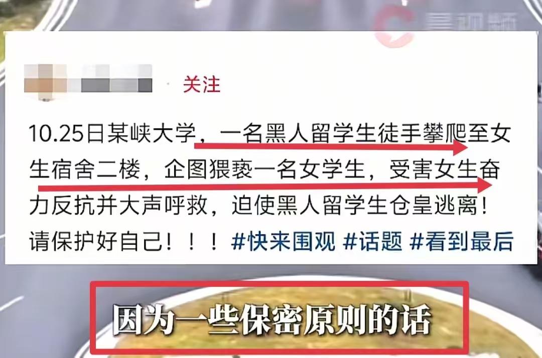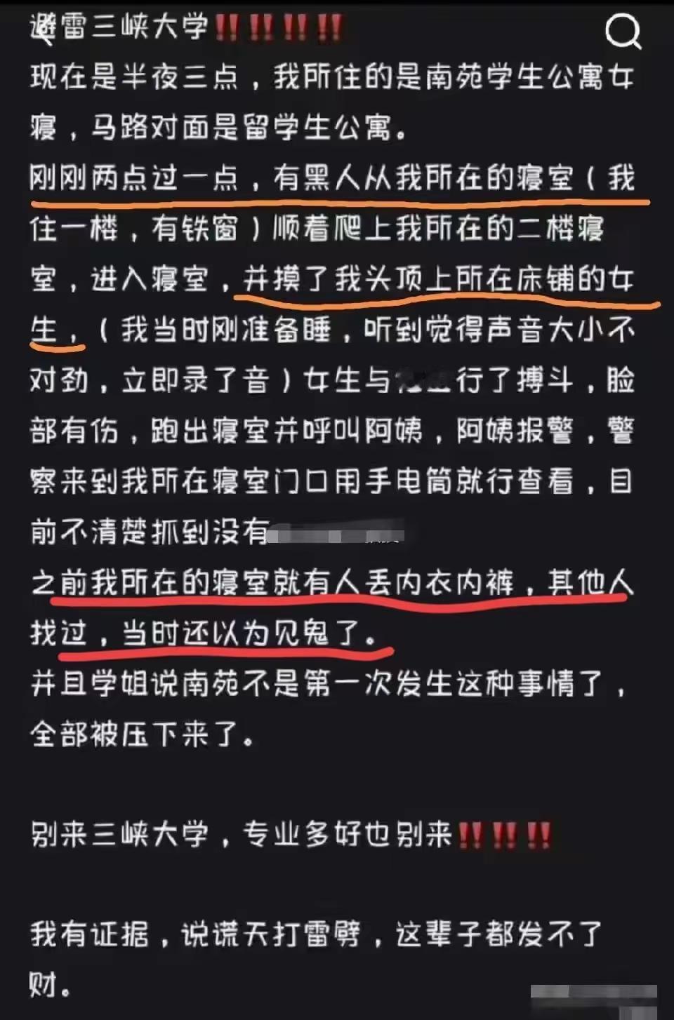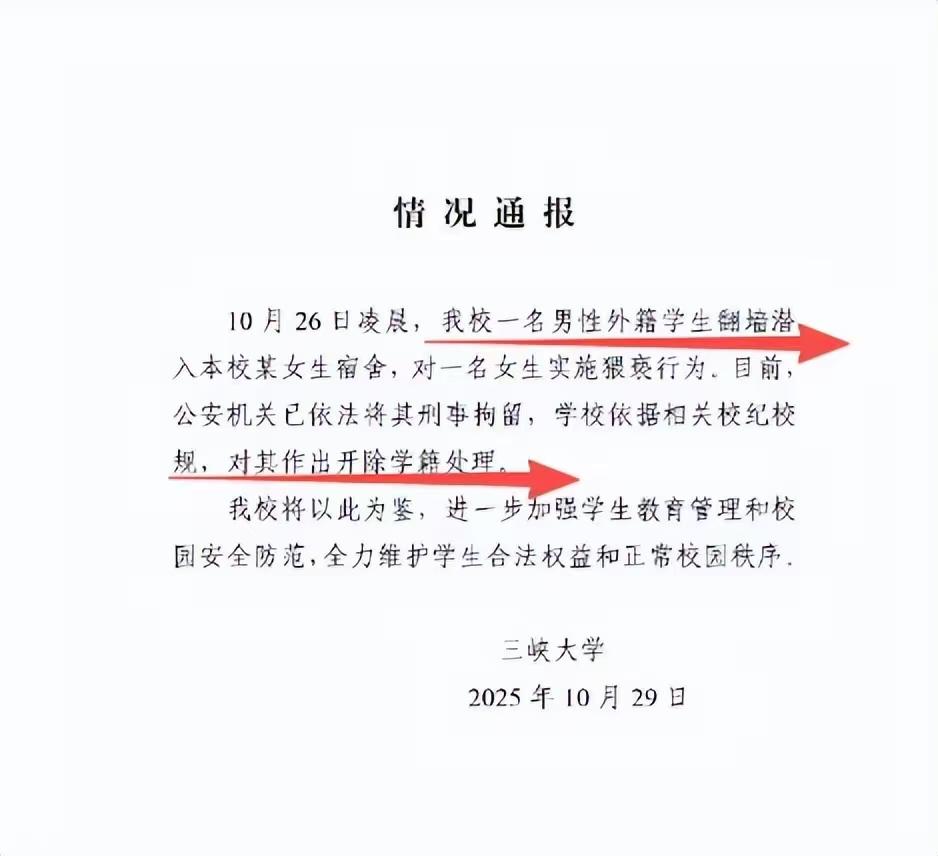 三峡大学扛不住了,黑人留学生硬闯女生宿舍,猥亵一名女生的事情,校方在五天后做出了通报。 事情发生在10月25号,而且宿管阿姨已经报警,情况已经属实。学校不仅没有及时做出通报和处罚,反而封锁消息想把事情压下去。 眼看舆论不断发酵,三峡大学已经压不住了,29号发了一则声明通报,将这位留学生黑头开除了学籍。 网友的愤怒点在于学校为何想要封锁消息,该校的女生反馈这样的事情之前也发生过,但都被学校方面悄无声息的处理掉了。难道我们对留学生都这样宽容?他们欺负的可是我们自己人,未来的花朵啊!