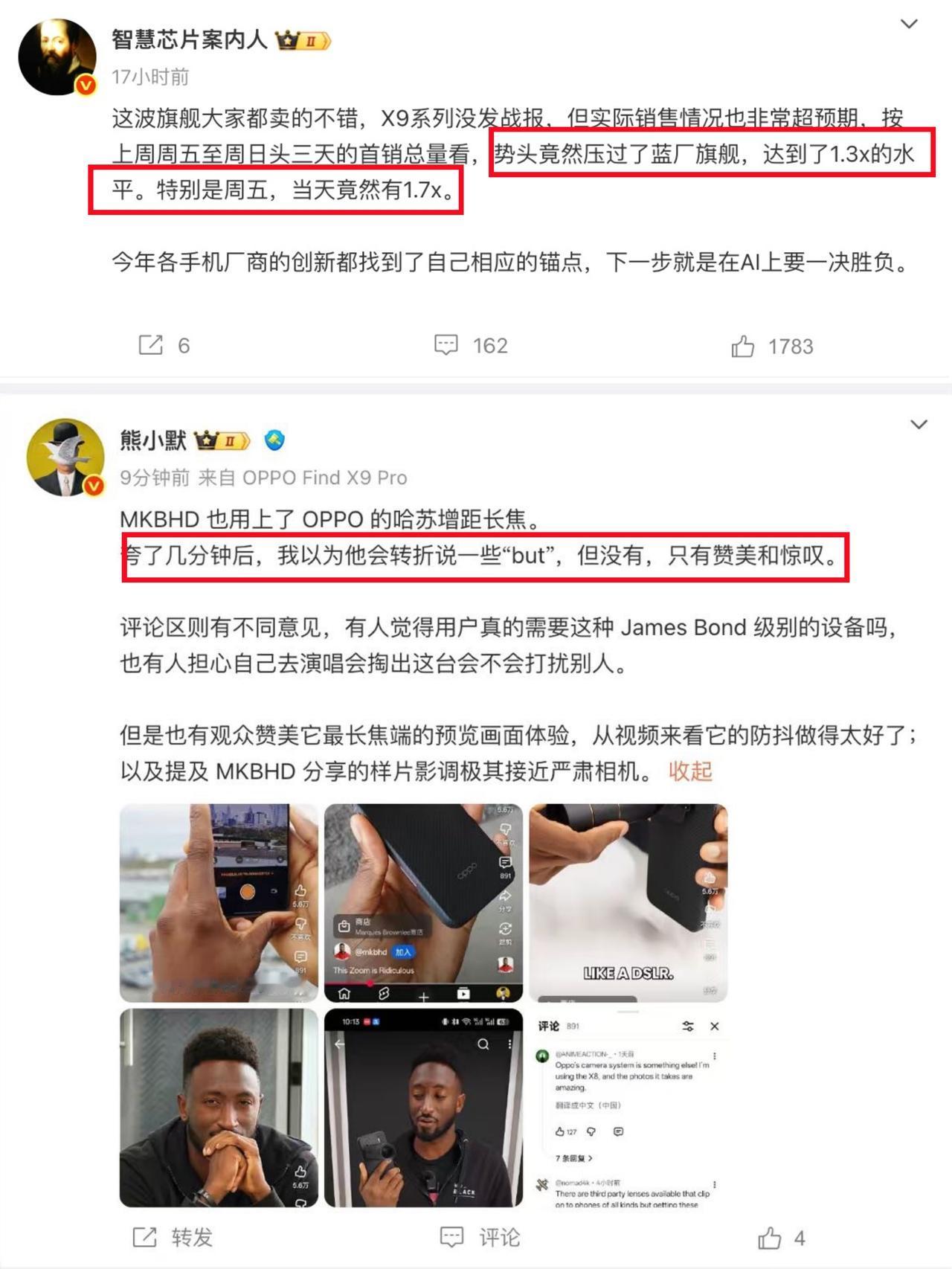 笑死😓Find X9是因为卖断货了才不发战报? 之前还纳闷OPPO为啥不发战报… 看看大V发的消息,Find X9系列周五当天销量直接冲到蓝厂同期旗舰的1.7倍?!三天累计销量是1.3倍,这人气属实有点猛😮而且首销当天追光红就很多版本缺货了,二手市场居然还溢价了📈所以X9系列不发战报是卖断货了,怕发战报进一轮狂抢吗?😂 刚又刷到油管科技区一哥MKBHD上手视频,难得听他全程没加“But”,还提了句X9系列产品力确实OK。看来这次Find X9是真的靠实力卖爆的,毕竟全系天玑9500芯片➕7000mAh+超大电池➕哈苏四摄,Pro版还有2亿哈苏长焦确实狠🎉 现在纠结要冲白色还是钛色…怕再观望两天真要抢不到了😭 国产手机OPPO Find X9
