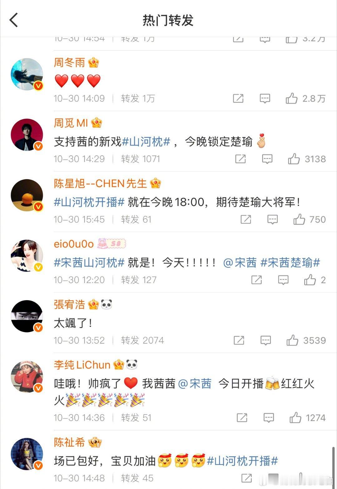宋茜微博转发区 宋茜《山河枕》开播获群星助力!杨紫、田嘉瑞、王鹤棣等转发,大半个