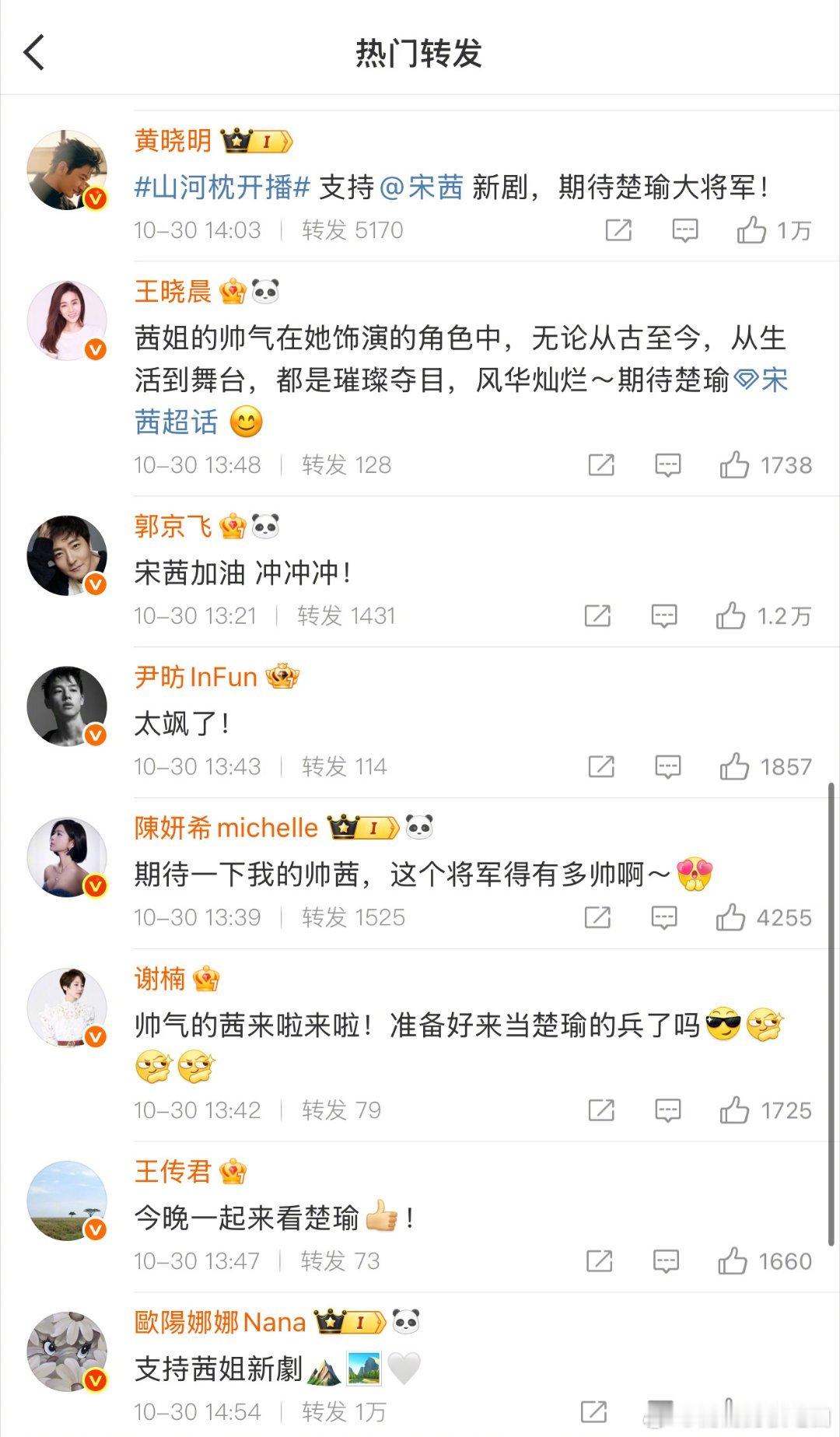 宋茜微博转发区 宋茜《山河枕》开播获群星助力!杨紫、田嘉瑞、王鹤棣等转发,大半个娱乐圈打call,楚瑜排面拉满!