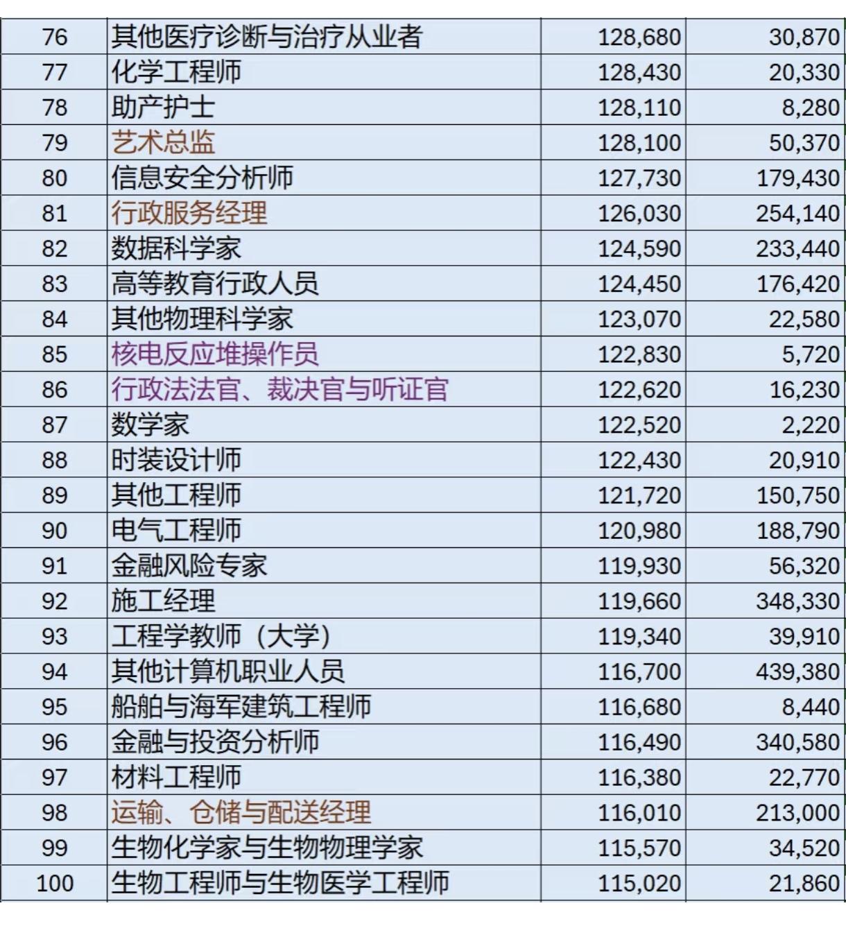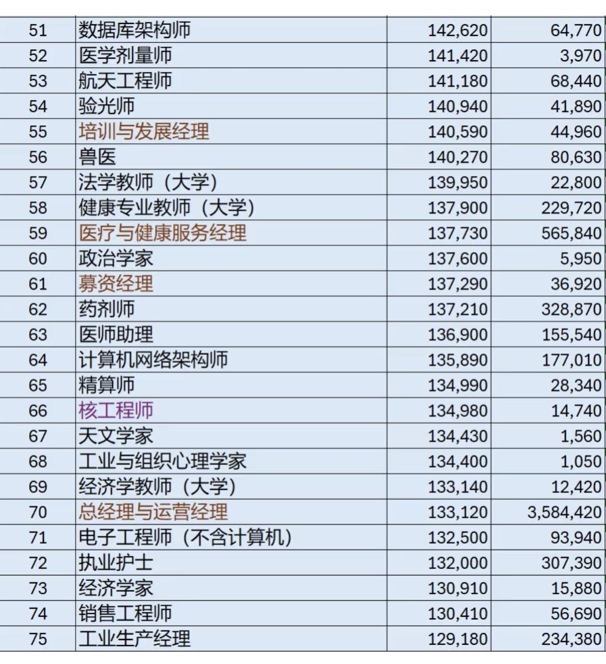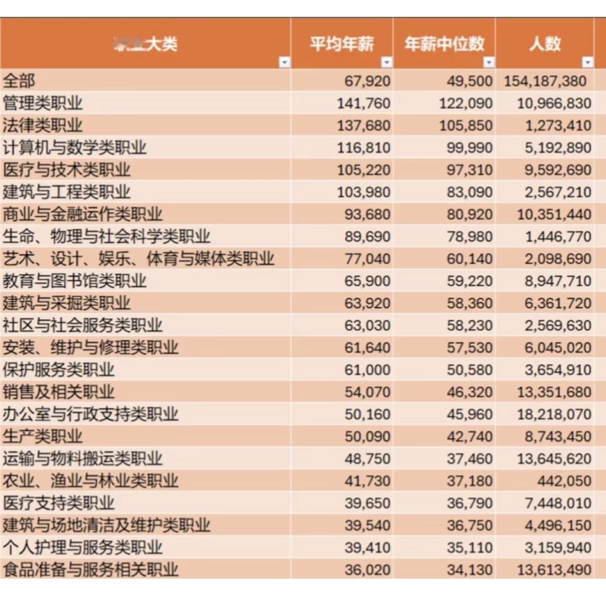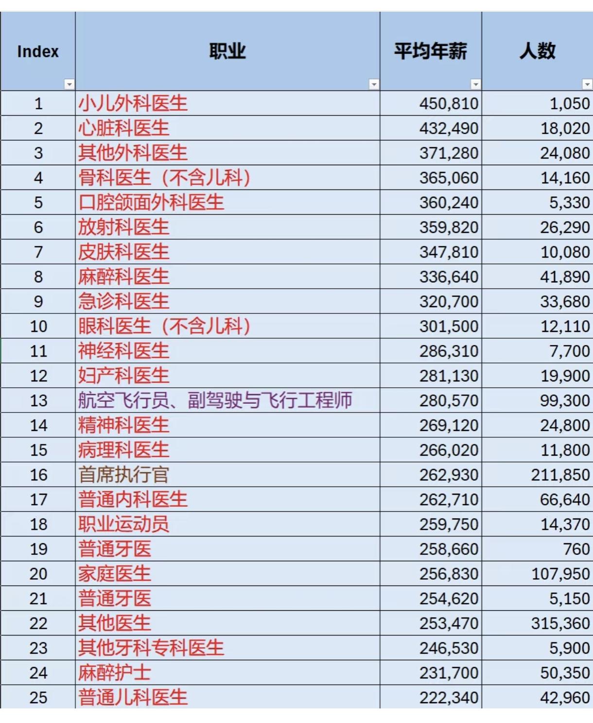美国的医生怎么收入这么高?相比国内医生的苦哈哈,美国的医生那就太幸福了。待遇高,强度还没国内那么大。 你说医学的书难读,那国内的医学生在学校就轻松了?读最多的书,背最多的知识点,还要辛辛苦苦在医院搞几年的规培,结果出来月薪一万左右可能有些地方才几千,谁愿意去读? 大家也都看明白了,这几年医学录取分数线快速下降,学霸都去搞计算机互联网了。没有顶尖的生源,以后医院医生都是二本水平,你敢放心去看病?敢放心把身体交给他们去动手术? 影响是巨大的,相关部门应该意识到这一点。 (数据来自2024年5月美国劳工局)