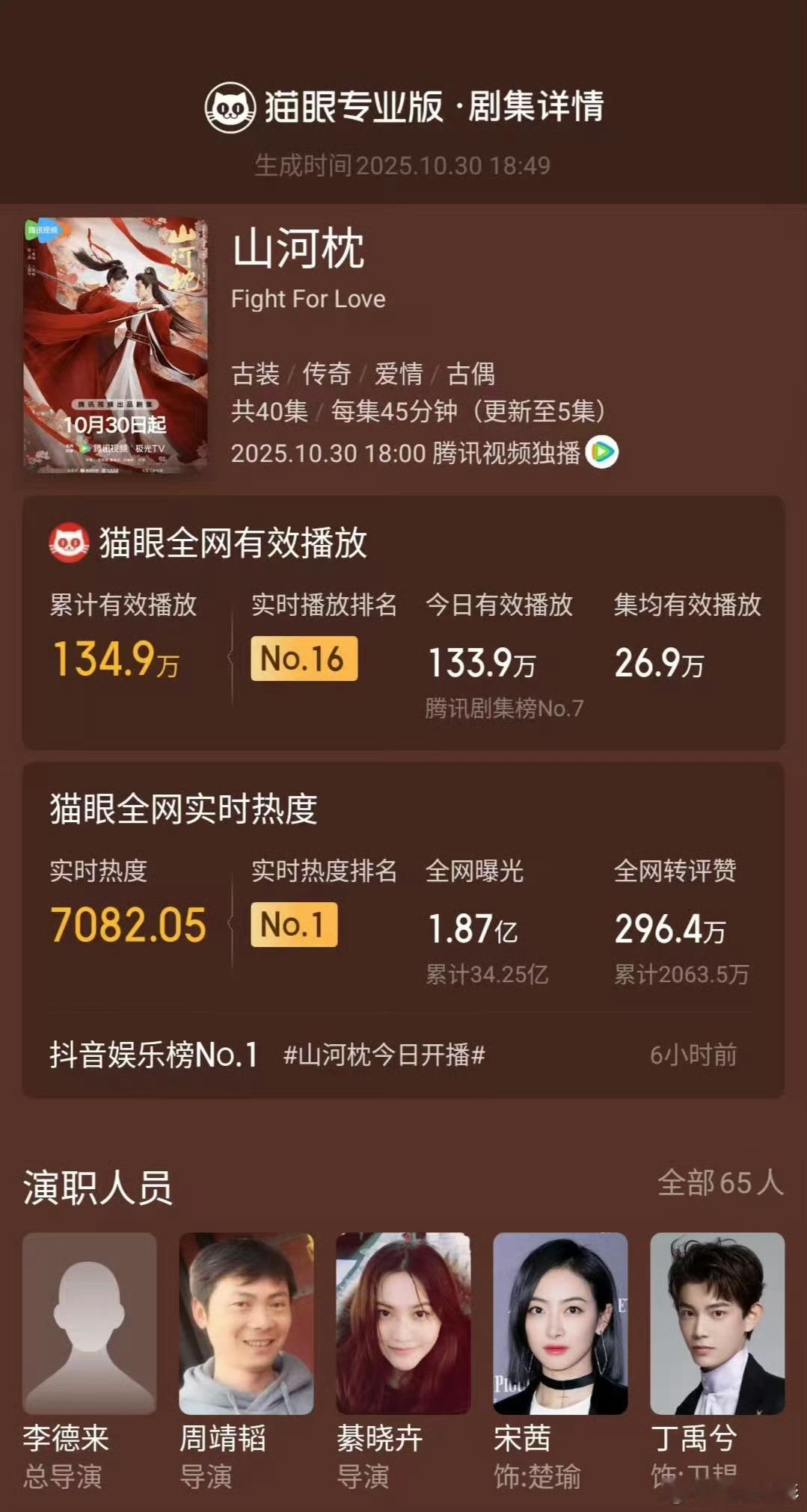 山河枕热度不错啊!刚开播猫眼就直接登顶,站内热度破22000[点赞]丁禹兮号召力