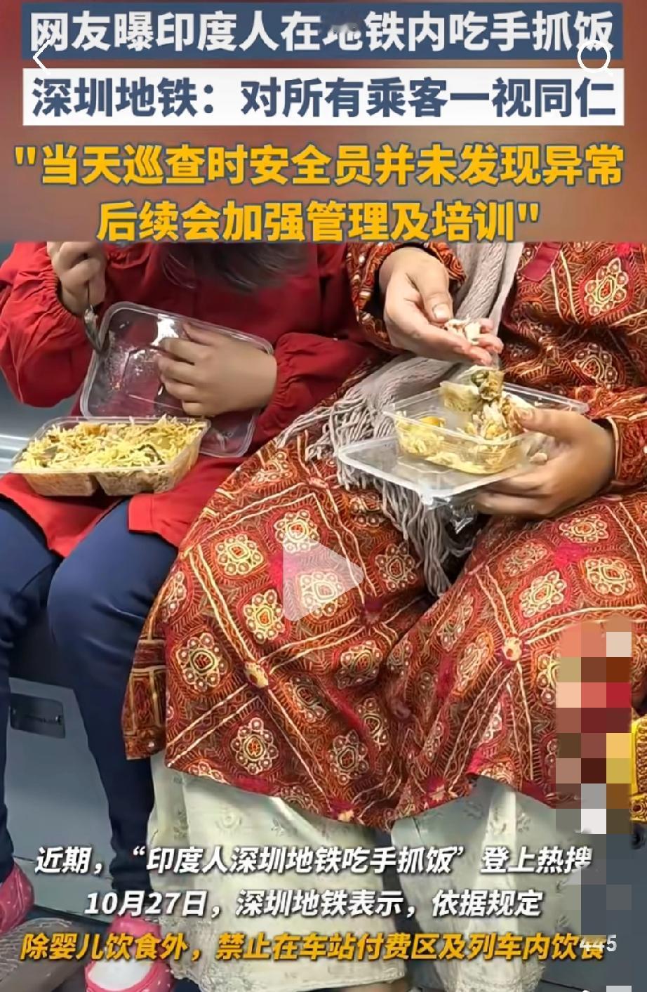 刚看到一条话题在网上引发热议。深圳地铁这事儿确实有些膈应人! 俩印度人早高峰在车厢里手抓咖喱饭,溅到别人裤子不道歉,残渣掉一地,劝了还装听不懂! 有人说这是文化差异。别扯了,这就是没素质!深圳地铁规定明明禁止饮食,国内乘客犯规就罚款,凭啥外国人就能含糊了!地铁说安全员没看到,希望这理由是真的。 真不是针对谁,来中国就得守中国的规矩,就像咱去国外也得入乡随俗一样。尊重文化没问题,但公共场合的秩序得守吧!总不能因为是外国人就搞双标。 你们觉得下次再遇到这种事,该咋处理才好?深圳地铁印度人