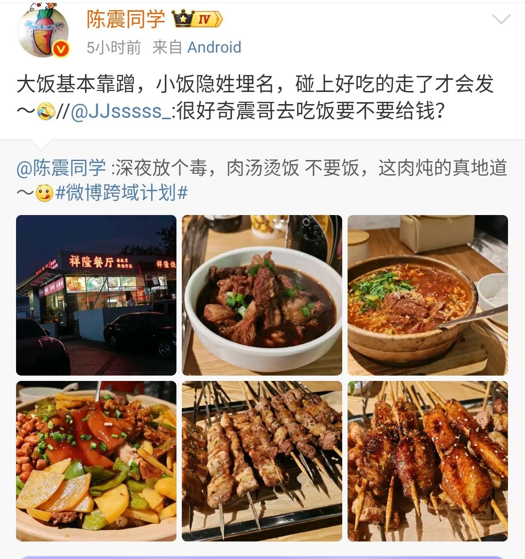 网友:好奇震哥去吃饭要不要给钱? 陈震:大饭基本靠蹭,小饭隐姓埋名,碰上好吃的走了才会发~[允悲] 这样做还是挺好的,反正便宜的自己买单了,碰到好吃的帮饭馆宣传一波。 如果是价格贵的,然后又蹭到饭了又比较好吃,那么肯定会免费宣传一波。 看来爱吃的人都喜欢蹭饭呀,各位是怎么看的?欢迎评论区留言。