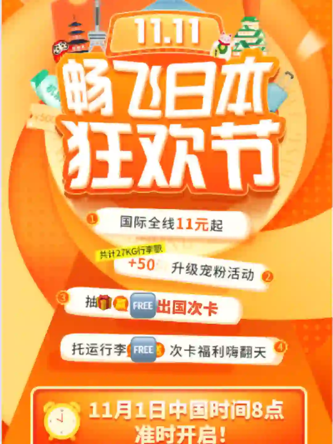 ❶11月1日8点起,有11元特价机票!数量有限!抢完还有111元机票~(北京上海天津南京宁波哈尔滨飞东京,不含税不含行李额)