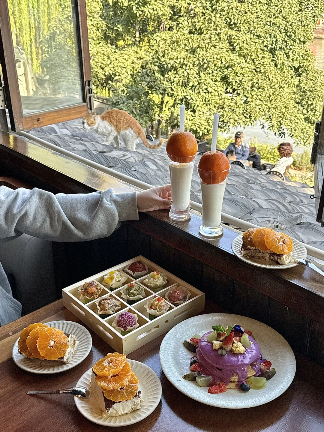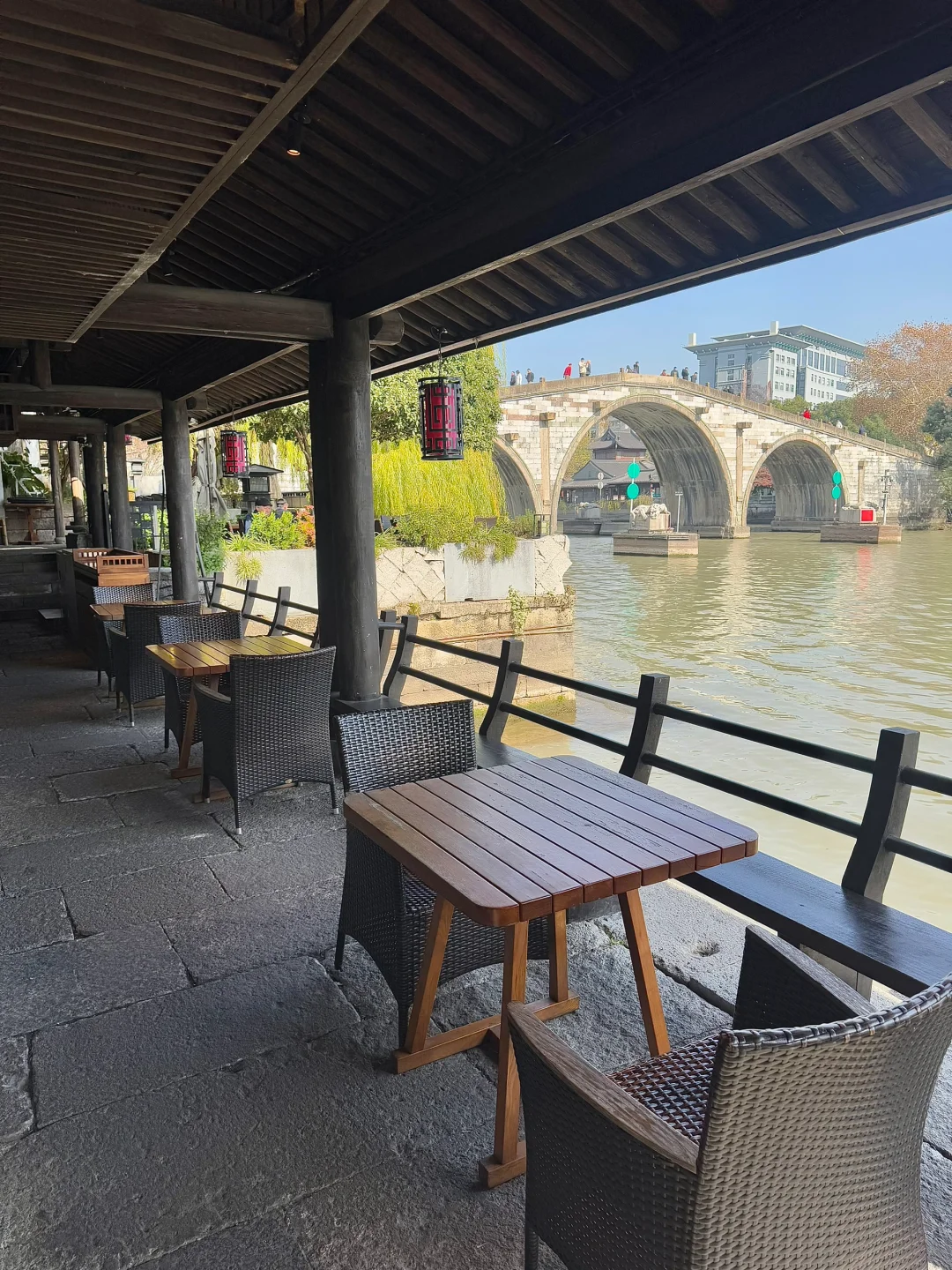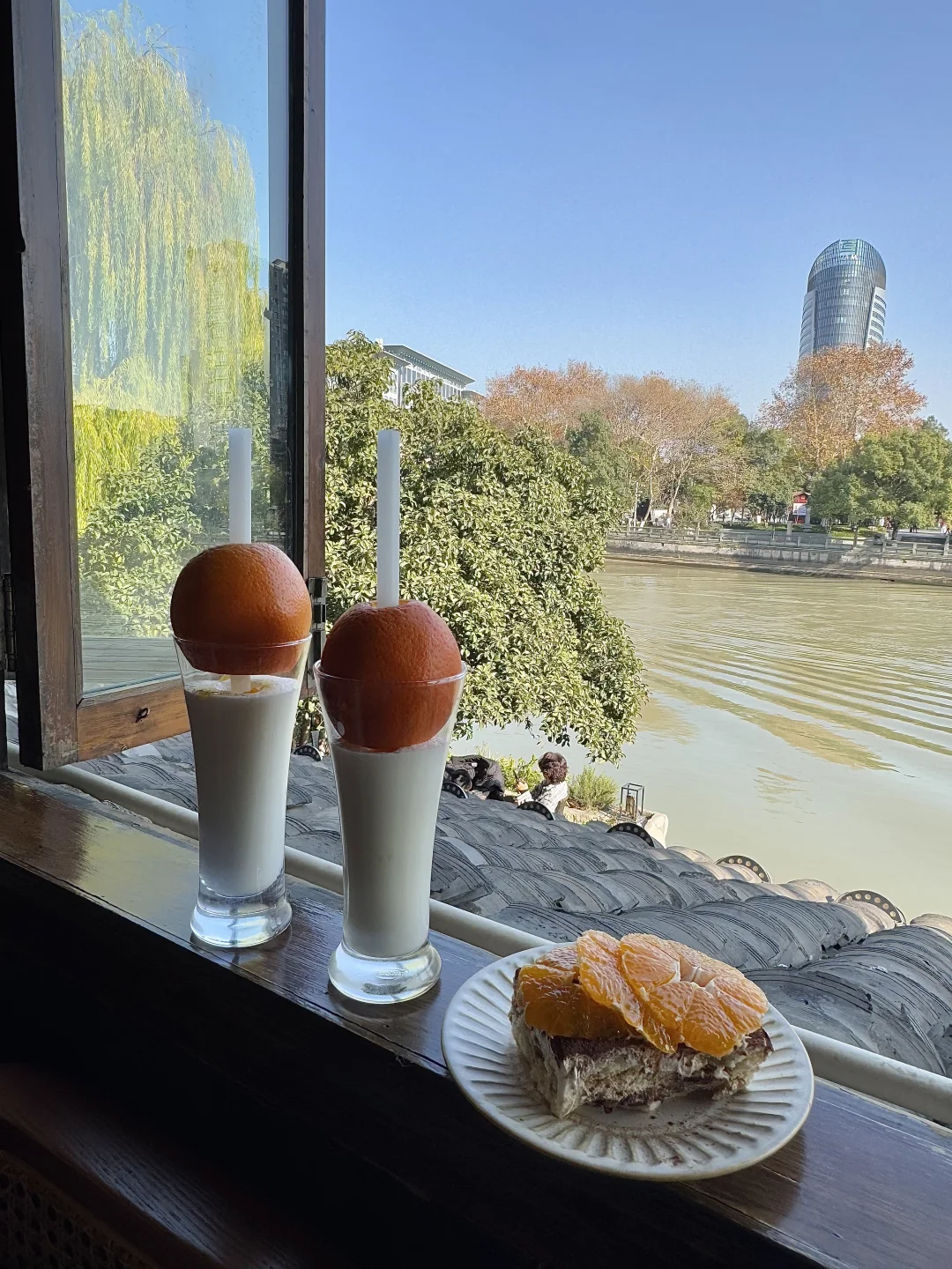 在小河边吃饭真的很 chil...拍照好有氛围! 火山熔岩芝士鸡、寿司、提拉米苏…都挺好吃的~