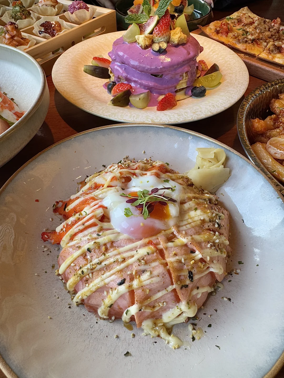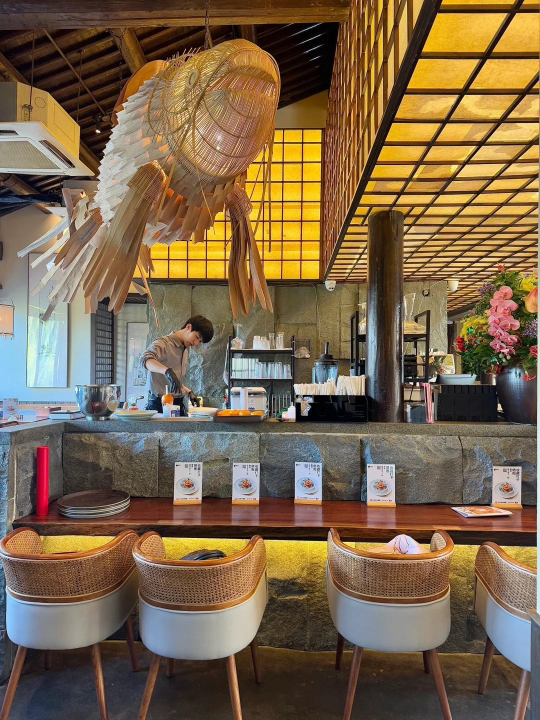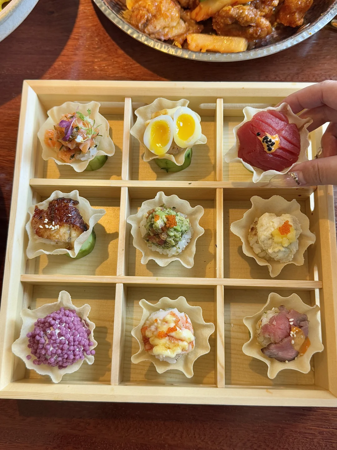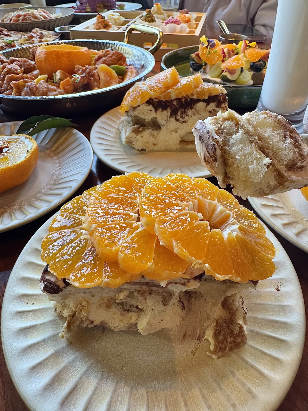 在小河边吃饭真的很 chil...拍照好有氛围! 火山熔岩芝士鸡、寿司、提拉米苏…都挺好吃的~