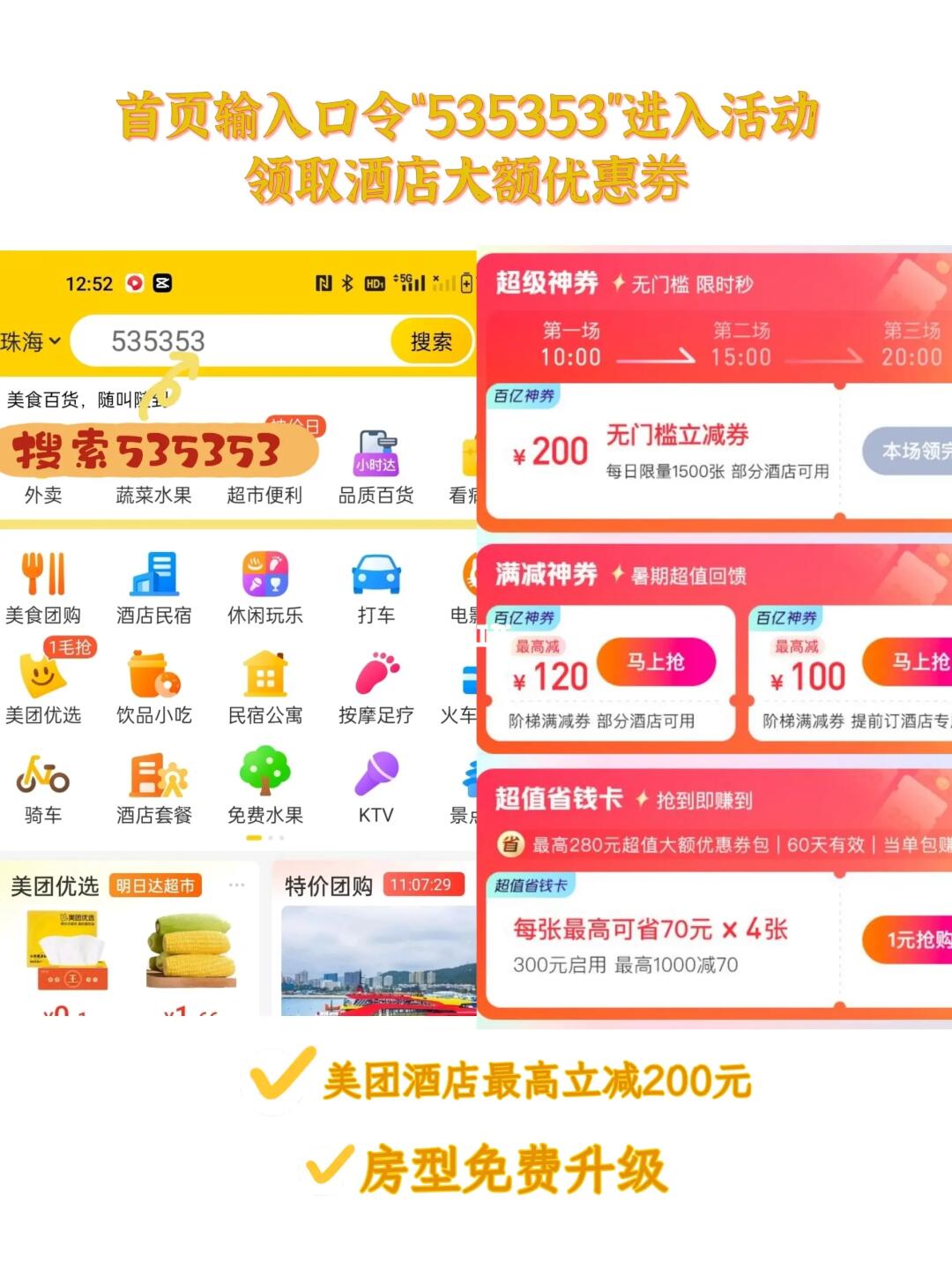 ㊙️大家想优惠订酒店可以打开美团App搜🔎【535353】,即🉑领取美团酒店百亿神券超多2️⃣0️⃣0️⃣元无门槛的大额优惠券领到手软,