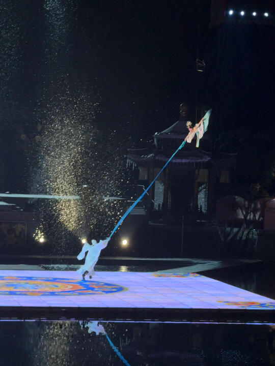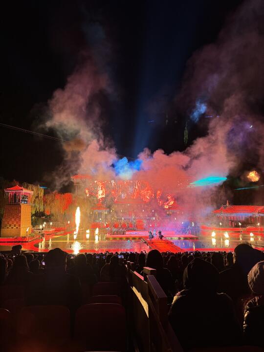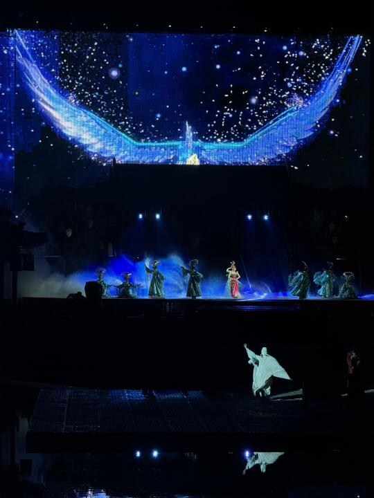 我们坐的中A的位置,可以很清楚的看到舞台的细节,万星闪烁的天空、富丽堂皇的宫廷殿宇、滚滚而下的雾瀑、熊熊燃烧的火海、漫天飞舞的雪花,让观众沉浸式感受冬日《长恨歌》冰雪剔透,盛世恢弘的浪漫之美.....太壮观了!