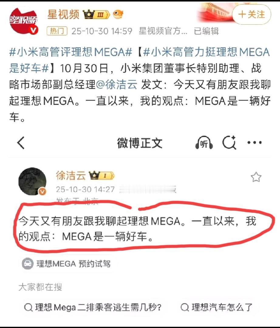 小米高管再次重申:理想mega是一辆好车! 网友在评论区吐槽道:小米、理想这两个新能源品牌近段时间都是负面舆论缠身,在资本市场的表现也是逆势下行。这一对卧龙凤雏,这是抱团取暖的节奏吗? 更有同时手持小米和理想股票的股友在评论区表示:看到别家的股票天天涨,真的想死的心都有了,我咋运气这么背呢?哪怕小米或者理想换一个小鹏也好啊!小米和理想的基本面也没变啊,难道就因为近期的两起自燃事件吗,两家的股票都快跌成狗屎了! 大家怎么看?
