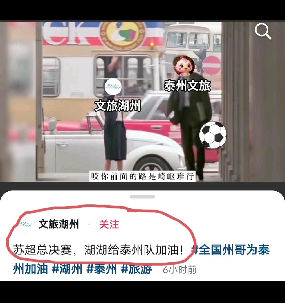 苏超总决赛,湖州文旅站队泰州,为泰州队加油助威! 湖州文旅为什么不给南通队加油,而是站队泰州,貌似评论区的网友给出了正确的答案:海陵的海没了,湖州的湖没了,加之又都是“州”之辈,是本家。不给泰州加油,难道给八竿子打不着的南通加油啊! 话说这样的解释也是入情入理哦,干脆这样好了,以后湖州泰州就是结对帮扶对象好了。下次我们湖州跟苏锡常抢太湖水域管辖权的时候,你们泰州可要帮我们湖州哦!