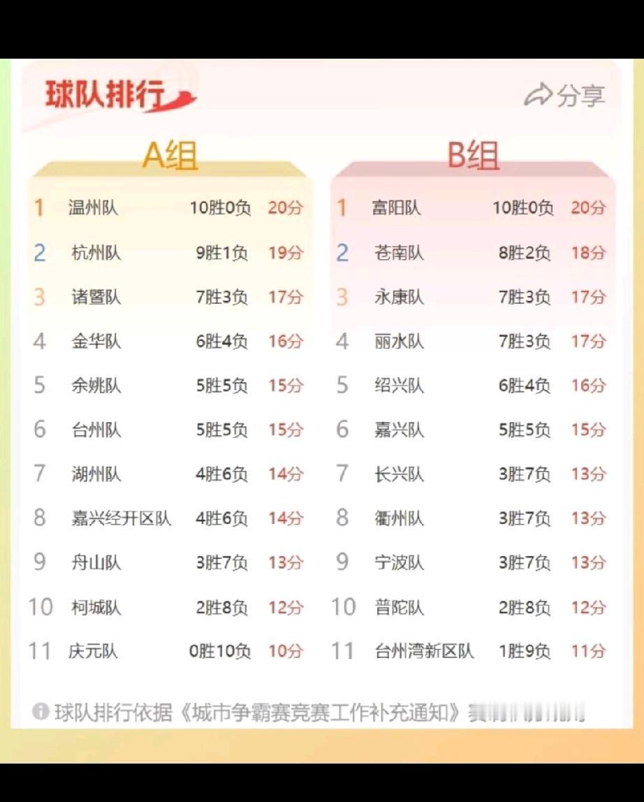 丽水vs苍南这场比赛的结果出来以后,让我们不得不重新审视上次那个“阵容补强”方案的合理性? 现在给我很直观的感觉就是:“阵容补强”之后,县区小队明显吃亏,市联队优势越来越大,特别像苍南这种小城市,人口本来就少;补强规则还临时加限制;再加之赛程拉的这么长,很多主力球员伤的伤、残的残,真的没法玩! 这场比赛结束后,两队都是8胜3负,同积19分,丽水队应该超过苍南队,来到b组的第二位了!