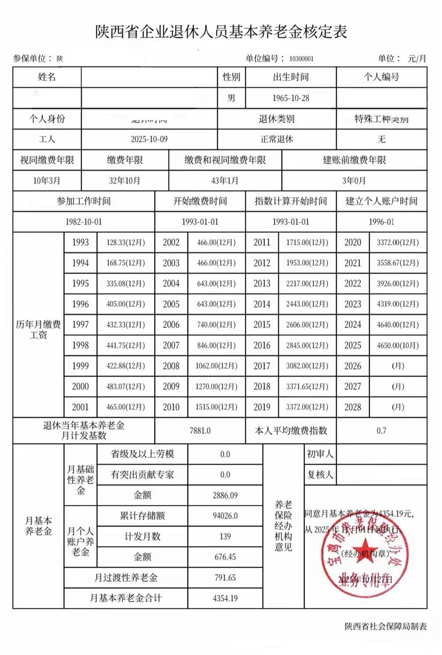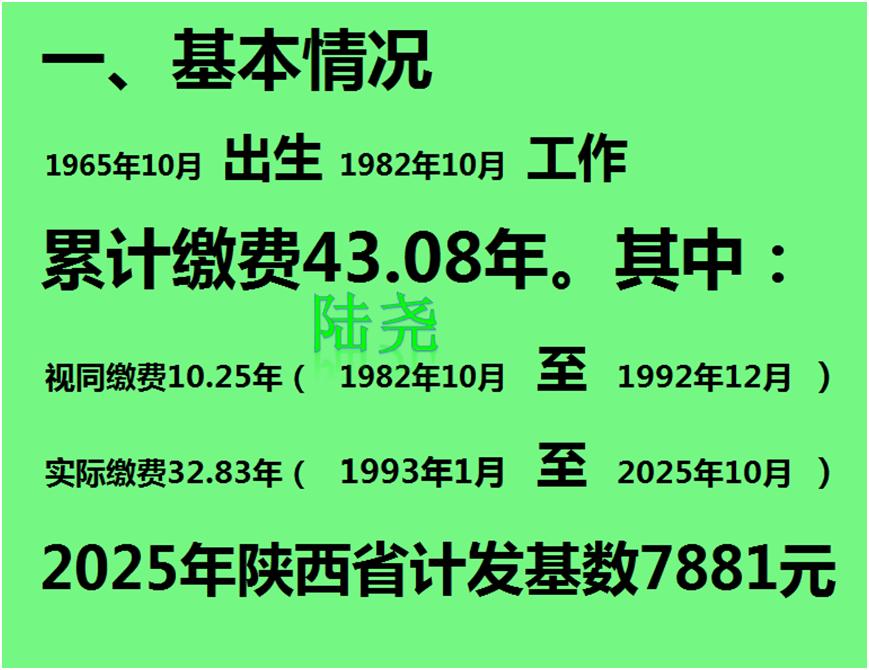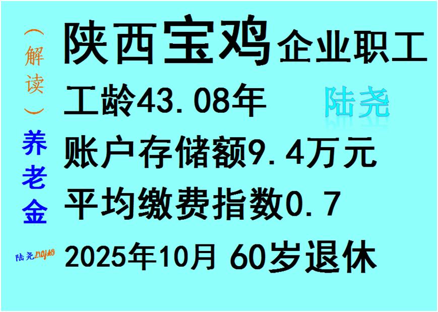 陕西宝鸡职工17岁步入职场,每年工龄折合100元的退休养老金是什么水平? (解读)陕西省宝鸡市企业职工2025年10月60岁退休养老金。 工龄43.08年。 账户存储额9.4万元。 平均缴费指数0.7。 一、基本情况 1965年10月出生,1982年10月工作。 累计缴费43.08年。其中:视同缴费10.25年(1982年10月至1992年12月)、实际缴费32.83年(1993年1月至2025年10月)。 2023年陕西省计发基数7881元。 二、月基本养老金 1、基础养老金 =计发基数×(1+本人缴费指数)÷2×缴费年限×1% 基础养老金=7881×(1+0.7)÷2×43.08×1%=2886.09元 2、个人账户养老金 =个人账户累计存储额除以计发月数(60岁退休计发月数为139) 个人账户养老金=94026÷139=676.45元 3、过渡性养老金 =计发基数×本人缴费指数×建立个人账户前的缴费年限×过渡系数(过渡系数为百分之一点三) 过渡性养老金=7881×0.7×10.25×1.4%=791.65元 月基本养老金=基本养老金2886.09元+个人账户累计存储额676.45元+过渡性养老金791.65元=4354.19元 工作43.08年,核定退休养老金为4354.19元,折合每年101.06元。 祝退休朋友,安康快乐!