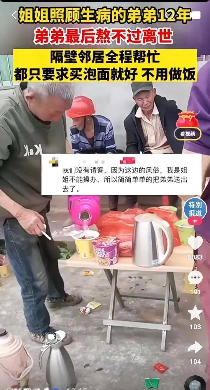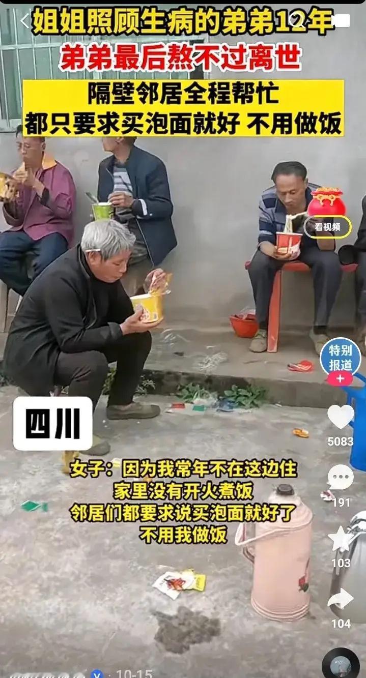 催人泪下的一幕!四川的一个年轻女孩照顾生病的弟弟12年,当弟弟最后被病魔夺走生命的时候,村里面的隔壁邻居的过来帮忙处理后事时,大家都竟然能通情达理要求女孩不用做饭,一切从简,买碗泡面吃一下就好了! 院坝里的矮凳上,邻居们捧着泡面蹲坐成一片。张叔蹲在石阶边,吸溜着面汤说“这娃十二年没松过劲,哪能再让她忙饭”,话没说完,筷子顿了顿。 女孩站在屋门口,看着邻居们往热水壶里续水,泡好一碗碗面。李婶端着加了火腿的泡面过来,塞到她手里:“趁热吃,你弟走得安心,知道你有人帮衬。” 有人搬来折叠桌,摆上几桶没拆的泡面,说“家里没开火,咱就凑活吃,事咱帮你盯牢”。女孩捏着泡面桶,指尖裹着热气,眼泪砸在桶沿上。 她想起弟弟总说“姐,等我好点给你煮面”,现在碗里的面冒着火气,却没人跟她分半桶。邻居王大爷拍了拍她的肩:“哭出来就好了,往后有啥难处喊一声。” 院角的热水壶滋滋冒气,泡面的香味裹着山风飘开。没人提“规矩”“排场”,只把热乎的面往女孩手里塞——这碗泡面,是村里人裹在粗粝里的软和,裹着对她十二年辛苦的疼惜。照顾弟弟的日子 弟弟故事 照顾生病弟弟