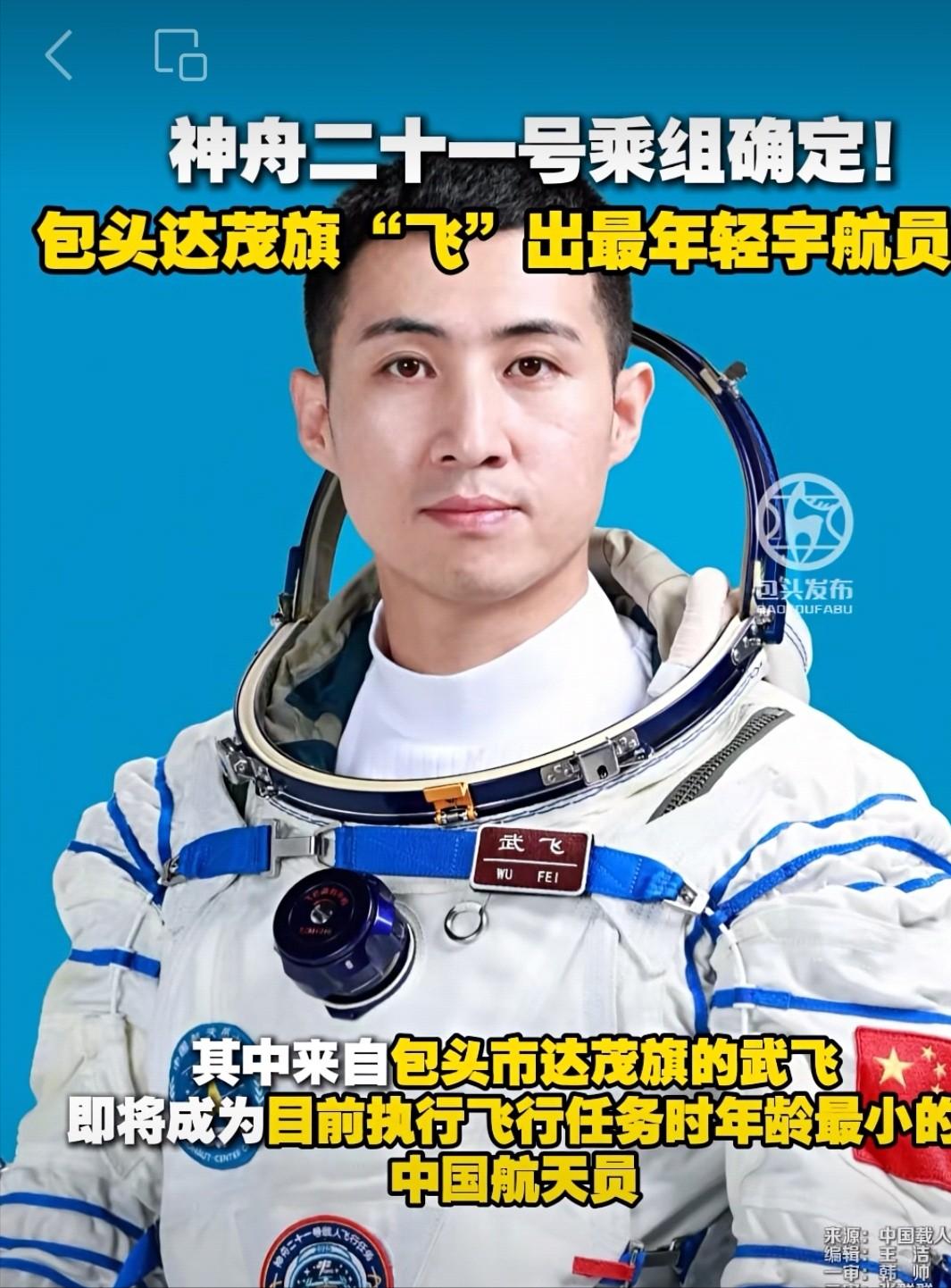 武飞是来自内蒙古包头市达茂旗的中国最年轻航天员,属于我国第三批航天员,准备执行神舟二十一号飞行任务,是一名航天飞行工程师,也是目前执行飞行任务时年龄最小的中国航天员。 武飞这孩子的经历,说出来能让咱们这些过来人特别感慨。 他 1993 年出生在达茂旗的草原上,小时候白天看牛羊满地跑,晚上就跟着当民办教师的父亲学数学,那些数字公式在别的孩子眼里枯燥,他却看得入迷。 父母心里清楚 “读书能改变命运”,从小学就送他去乡里、县城读书,父亲一个人扛下家里所有农活,母亲专门陪着他在外求学。这份沉甸甸的爱,硬是把草原上的娃送出了茫茫草原,为后来飞向星河铺了路。 高中时的武飞迷上了武器装备,看着杂志上的先进设备,他心里憋着股劲:“啥时候咱们国家的装备也能世界领先?” 这份执念让他高考考出了 646 分的好成绩,直接扎进了北京航空航天大学学飞行器设计,那可是航天领域的顶尖学府,646 分在当年就是千军万马过独木桥的硬实力。 硕士毕业后,他顺理成章进了中国航天科技集团的空间技术研究院,成了真正搞航天的工程师,那会儿他就跟着团队参与载人航天、月球探测等航天器的研发,实打实摸过真家伙。 在研究院那几年,武飞早就显露出了过人的本事。2020 年天和核心舱在天津做试验,他当真空系统负责人,碰上了个大难题。 核心舱在真空罐里测试电解制氧时,排出的氢气会影响真空度,搞不好就会引发放电,整个设备都可能出危险。 当时时间特别紧,武飞凭着在多个热试验组攒下的经验,带着团队连夜琢磨,硬是设计出一套专用的氢气排放系统,把风险给排除了,试验顺顺利利完成。 他的老师傅后来评价他,只要交给他的事,不管多急多难,肯定能办得妥妥帖帖,这股沉稳劲在年轻人里太少见了。 2019 年第三批航天员选拔的消息传来,武飞想都没想就报了名。从幕后造飞船的工程师,到台前驾飞船的航天员,这步跨得可不容易。 咱们都知道航天员训练苦,光那个离心机测试就够吓人的,8 个 G 的重力加速度压在身上,脸都能被扯变形,呼吸都费劲,武飞说这就是意志力和热爱的比拼,要是不打心底里爱这行,根本扛不下来。 还有水下训练,穿着厚重的舱外服在水里泡好几个小时,模拟太空出舱动作,精确到厘米级,他以前搞设备是 “学深”。 现在当航天员得 “学广”,热学、力学、空间材料学啥都得懂,硬生生把自己练成了全能选手。2020 年 9 月,27 岁的他成功入选,成了第三批航天员里的佼佼者。 这次神舟二十一号任务,武飞的角色是航天飞行工程师,听起来专业,其实就像是空间站的 “大管家” 兼 “修理工”。 指令长张陆特意夸他,说这 “90 后” 思维活跃还沉稳,让人放心。要知道空间站组合体那么多设备,日常照料可不是扫扫地那么简单,温度、压力、电力系统都得盯紧,差一点都可能出问题。 武飞以前在研究院就天天跟这些设备打交道,哪部分容易出故障、怎么维护最靠谱,他门儿清,这可是别人比不了的优势。 更关键的是,他还要负责设备的维护维修升级和新技术验证,这活儿考验真本事。 就说这次任务要安装空间碎片防护装置,太空里的碎片速度比子弹还快,撞上空间站可不是小事,武飞他们得出舱把装置装到位,每一个动作都不能有偏差。 还有那些新技术试验,比如空间站在轨智能算力平台,以后能让太空里的设备更 “聪明”,这些都得武飞他们在天上一点点测试验证。 这次乘组要开展 27 项科学项目,光啮齿类哺乳动物太空实验就是头一回,4 只小鼠要在天上待半年,它们的生活环境维护也离不开武飞管的设备系统,这责任真不小。 有人可能会问,这么年轻能扛住吗?看看这乘组搭配就放心了,“70 后” 的张陆有神舟十五号的飞行经验,“80 后” 的张洪章是博士载荷专家,“90 后” 的武飞是技术尖刀,老中青搭配,既有经验又有冲劲。 武飞自己也说,这份幸运是因为赶上了航天大发展的好时代,可咱们都明白,幸运从来都是留给有准备的人。 从草原娃到航天工程师,再到最年轻的飞天航天员,他走的每一步都踩着汗水,32 岁的年纪能担起这份重任,靠的不是运气,是十几年如一日的钻研和苦练。 想想当年神舟五号发射时,咱们多少人守在电视前激动得掉眼泪,那时候谁能想到,二十多年后,咱们的空间站能长期有人驻留,还能有这么年轻的航天员挑大梁。 武飞这孩子代表的不只是他自己,是咱们国家航天事业的传承,是年轻人能吃苦、肯钻研的样子,更是咱们内蒙古草原养育出的骄傲。 再过一天,他就要带着家乡的期盼、国家的重托飞向太空,这趟半年的太空之旅注定充满挑战,但看着他那坚毅的眼神,就知道这草原走出的娃,肯定能圆满完成任务,给咱们带来更多好消息。