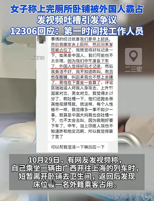 广西一女生买卧铺去上海,结果,她中途去了趟厕所,回来发现铺上竟然躺着一陌生男人,疑似印度人,正在呼呼大睡,女生由于不会说英语,怕和对方产生冲突,抱着“多一事不如少一事”的心态,只能忍气吞声,拍了视频发到网上,网友吐槽:今天占铺,明天就不知道占什么了。 10月29日,一名女乘客在乘车途中起身前往卫生间,不过五六分钟的功夫,返回时却发现自己的卧铺铺位上,已然躺着一名陌生的外籍男子,对方盖着她之前铺好的被子,睡得正沉。 这一幕让她有些手足无措,而接下来的选择,更是引发了全网的热烈讨论。 这名女乘客并非没有想过叫醒对方,只是毕业多年后,英语早已生疏,除了“hello”和“thankyou”这类基础词汇,根本无法进行有效沟通。 再看一眼时间,离列车到站只剩不到一小时,她心想自己之前也已经睡过一阵,没必要为了这点时间闹得不愉快,便抱着“多一事不如少一事”的心态,没有再做过多争取,只是拿出手机拍下视频,想在网上简单吐槽一下自己的遭遇。 这段视频经由向阳视频传播后,很快就突破了圈层,成为了网友们热议的焦点。 让女乘客始料未及的是,这段本想“诉苦”的视频,非但没换来预想中的同情,反而让她遭到了不少网友的批评。 有网友直言无法理解这种“退让”,在自己的国家里,凭票获得的合法权益,为何要因为对方是外籍人士就轻易妥协? 还有人提出疑问,如果占用铺位的是中国同胞,她还会如此“佛系”吗?大概率会直接叫醒对方沟通,甚至第一时间找乘务员协调吧。 更有网友毫不客气地表示,这种对外国人“通情达理”,换成本国人可能就变得尖酸刻薄的双重标准,实在让人难以接受,“怂”得让人无法理解。 网友们的争论并非毫无根据,说白了,卧铺铺位是乘客真金白银买来的,凭票使用本就是天经地义的规则。 遇到被占用的情况,选择忍气吞声,不仅自己受了委屈,还可能让对方误以为这种占用行为是理所当然,甚至可能助长得寸进尺的心态。 不少网友都觉得,这种时候根本没必要“哑巴吃黄连”,找列车员或者乘警来调查调解,才是最合理的做法。 面对这场愈演愈烈的讨论,12306官方客服很快就此事作出了明确回应。 客服表示,旅客在乘车过程中遇到床位被占、信息不符等情况时,完全没有必要妥协,更不需要自己硬扛。 不管对方是中国人还是外籍人士,工作人员都会第一时间介入,现场核对车票信息,就算存在语言沟通障碍,也能通过手势、翻译软件等方式解决,一定会协助旅客找回自己的床位,全力保障旅客的乘车权益。 其实换个角度想,网友的愤怒并非没有道理,花钱购买的铺位,本身就享有合法使用权,遇到占用情况主动维权,本就是理所应当的事情。 而女乘客的顾虑也能让人理解,语言不通确实容易造成尴尬,但这并不能成为放弃维权的理由。 列车上配备的乘务员和乘警,本身就承担着维护乘车秩序、保障旅客权益的职责,他们有足够的经验和资源来处理这类突发情况,完全不需要旅客自己委屈将就。 列车是流动的公共空间,凭票入座、对号入座是维持秩序的基本准则,这个规则不会因为乘客的国籍、身份而有所不同。 无论是中国人还是外籍人士,只要踏上列车,就应当遵守共同的乘车规则。 维护自身的合法权益,并不是小题大做,也不是不友好的表现,反而正是对规则的尊重。 毕竟,在规则面前人人平等,这从来都不是一句空话,而是每个公民都应当秉持的基本共识。 今天的分享到这里就结束了,大家对此事有何看法,欢迎在评论区留言和讨论,感兴趣的可以点击头像加关注,我将每日更新优质内容,我们下期见。